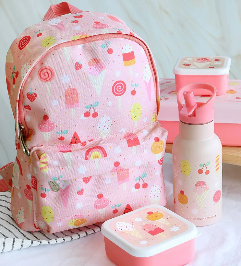 Flot A Little Lovely Company termoflaske i rosa, med print af is, bær og blomster i fine nuancer.