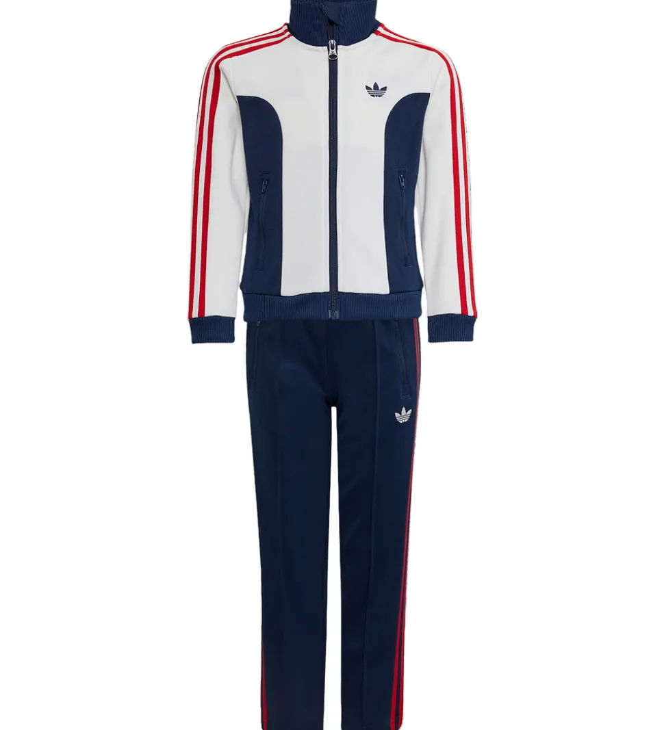 Flot træningssæt fra adidas Originals bestående af en hvid og mørkeblå cardigan samt et par mørkeblå bukser. Træningssættet har de ikoniske tre striber i rød langs ærmer og ben samt et diskret adidas-logo på både overdel og underdel. Adidas Originals cardiganen har lange ærmer og åbnes fortil med en gennemgående lynlås med hagebeskytter. Den har ribkanter ved kraven og ærmerne. Bukserne har en elastikkant i taljen, som justeres med indvendige snore, samt ribkanter ved anklerne for en god pasform.