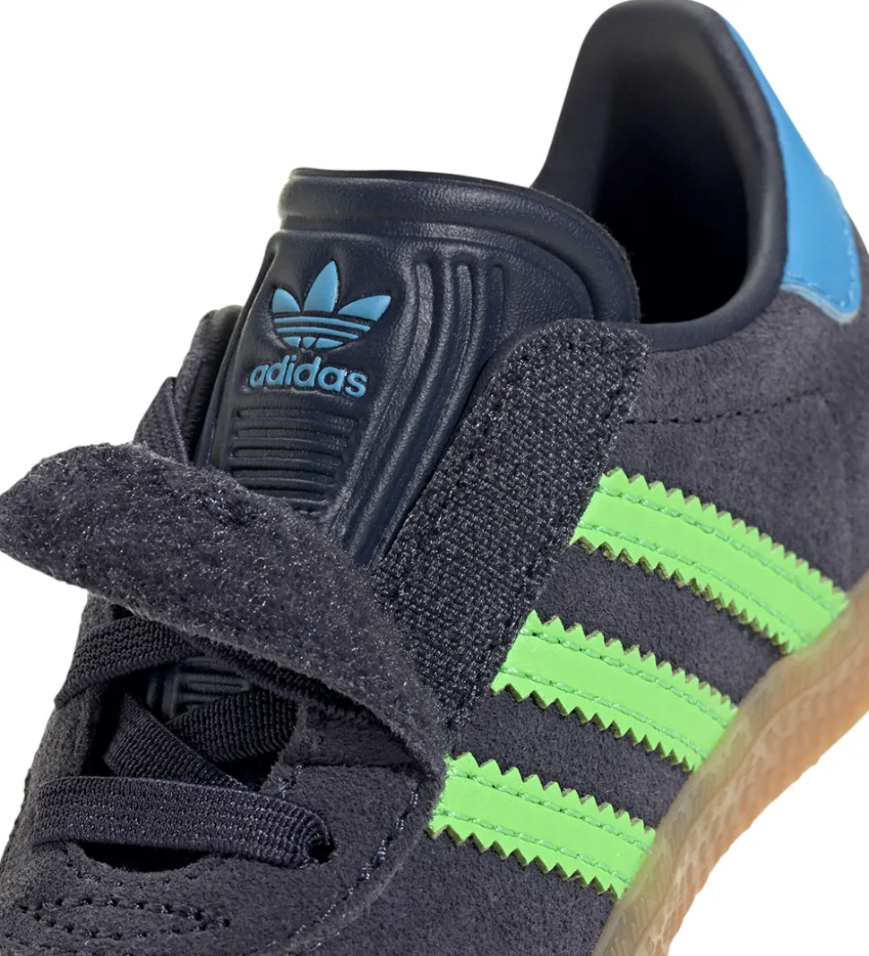 Fede adidas Originals sko i støvet, mørkeblåt ruskind med tre neongrønne logostriber af imiteret skind. Ved hælkappen er der lyseblåt, imiteret skind med et neongrønt adidas Originals-logo.