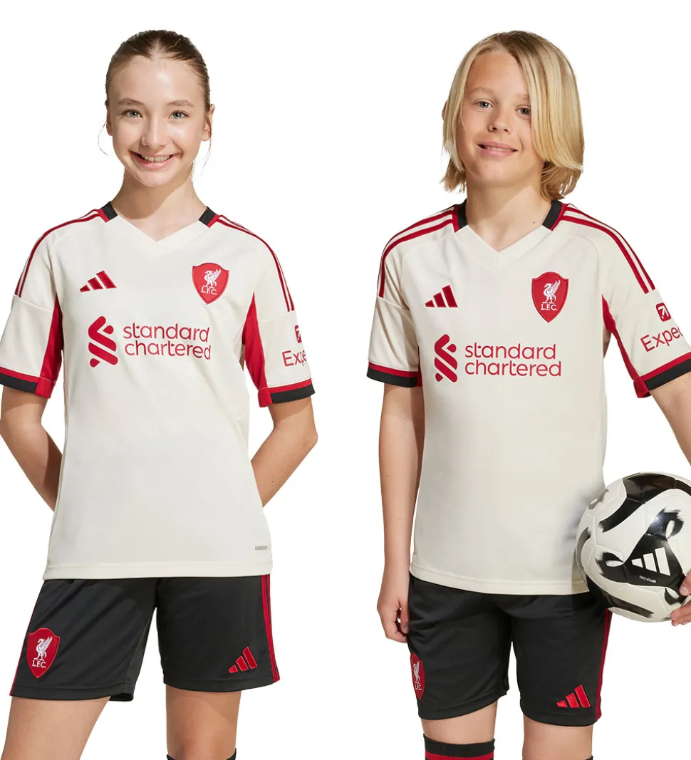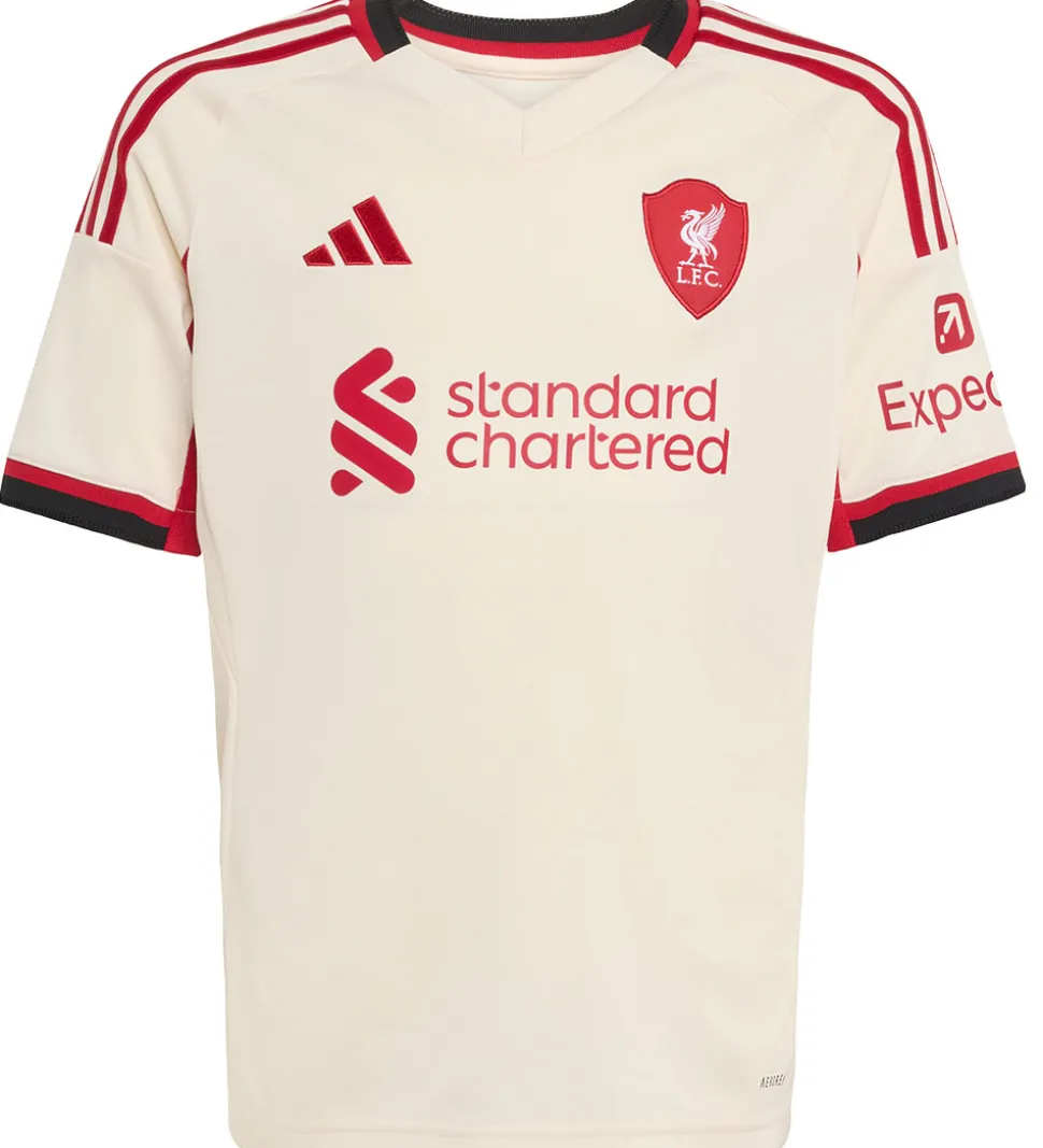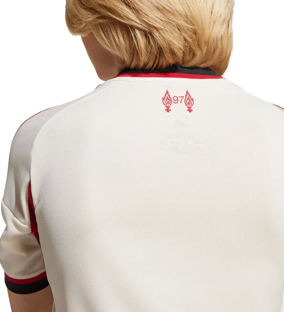Flot adidas Performance fodboldtrøje i hvid med røde og sorte detaljer, og fortil i venstre side er der et logo for den engelske fodboldklub Liverpool FC. Fodboldtrøjen er inspireret af holdes udebanetrøje i sæsonen 25/26.