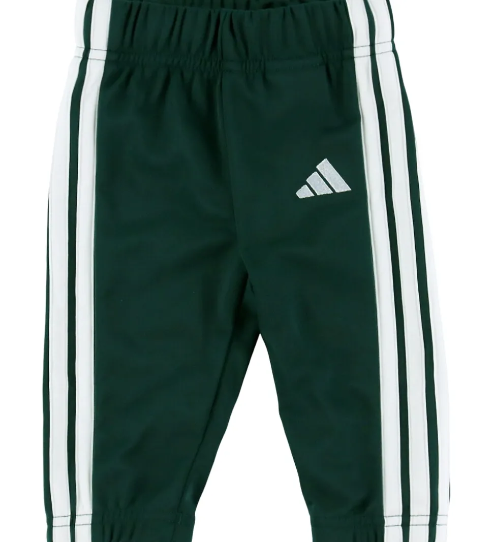 Flot adidas Performance træningssæt, der består af en cardigan og et par træningsbukser. Cardiganen er mørk turkis med hvide logostriber, og træningsbukserne er mørkegrønne med hvide logostriber.