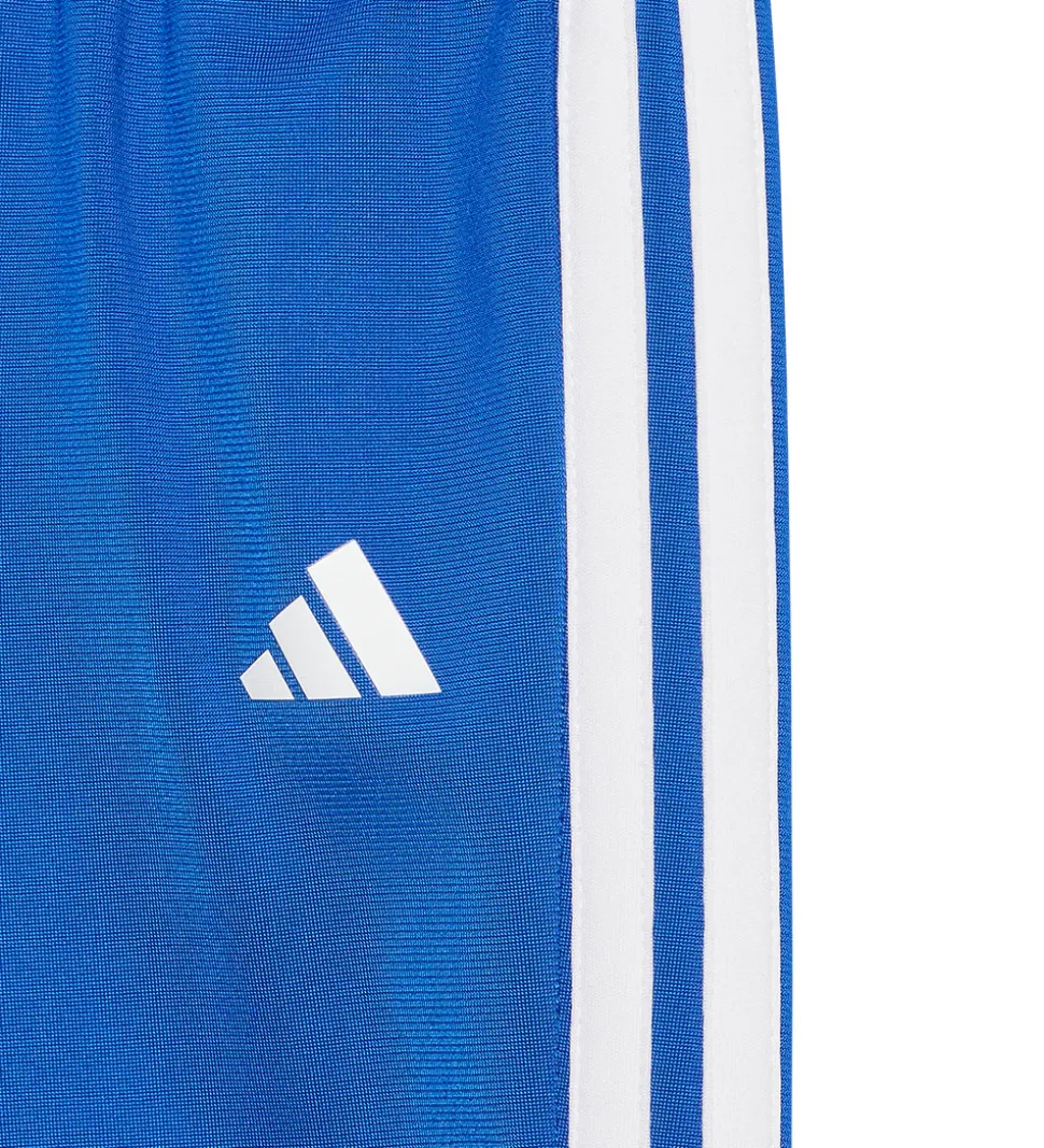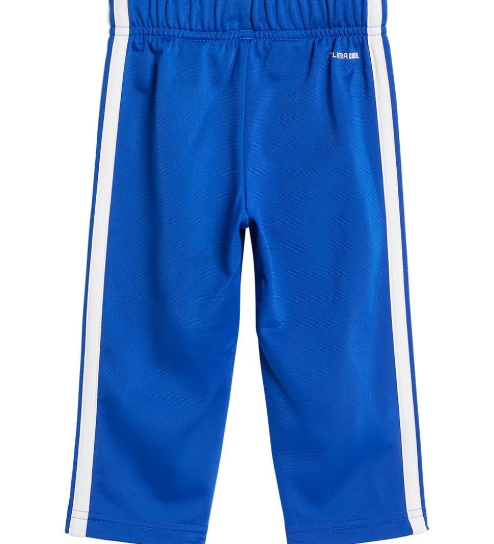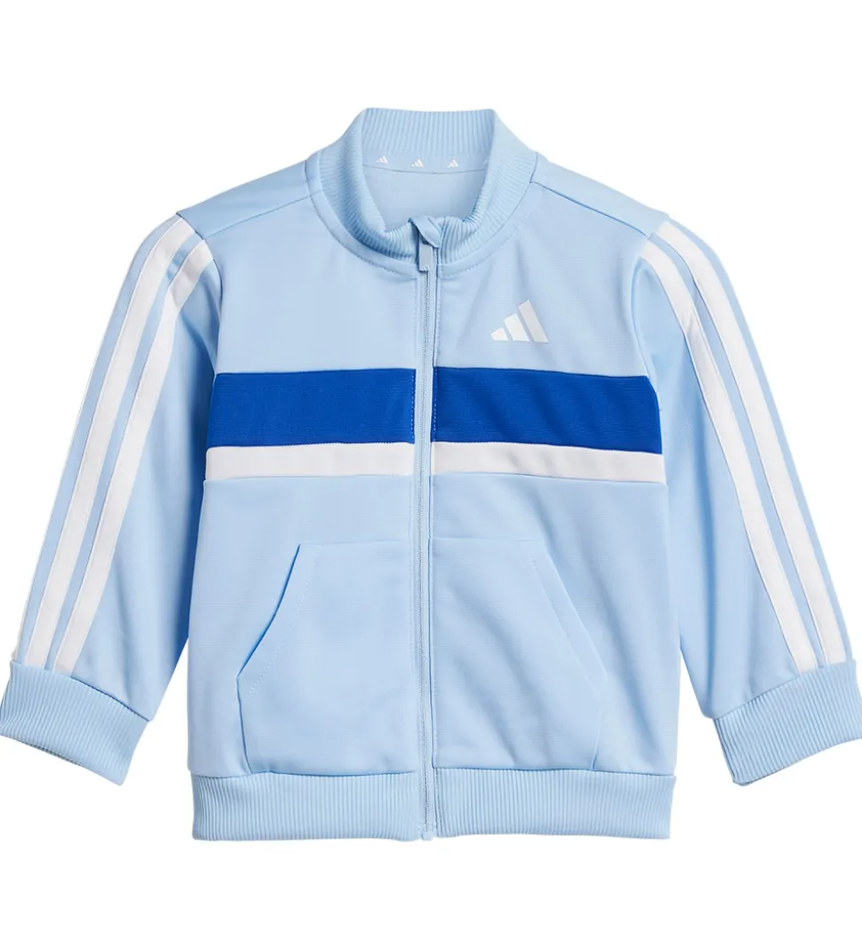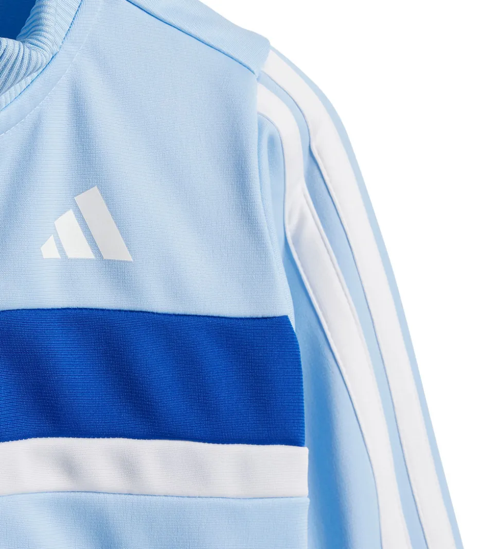Smart adidas Performance træningssæt, der består af en cardigan i lyseblå med et hvidt logoprint på brystet, en kongeblå og hvid stribe henover brystet og hvide striber langs ærmerne og et par bukser i kongeblå med et hvidt logoprint og hvide striber langs benene. Sættet er designet til komfort og passer ideelt til leg og aktivitet.