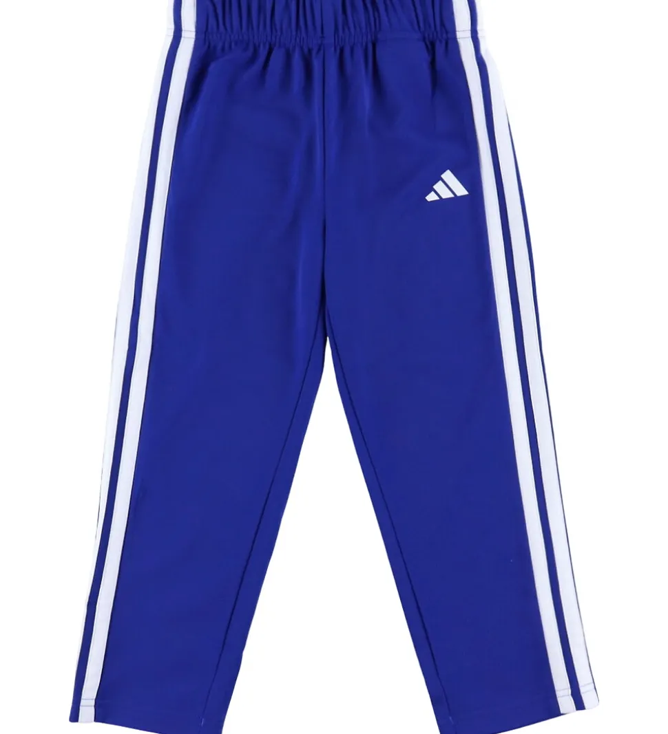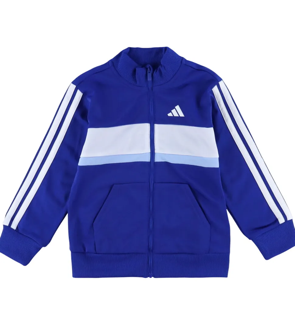 Smart adidas Performance træningssæt bestående af en cardigan og et par bukser i en flot blå farve med hvide striber og logoer. Cardiganen har en bred hvid stribe over brystet med en smallere stribe under i lyseblå.