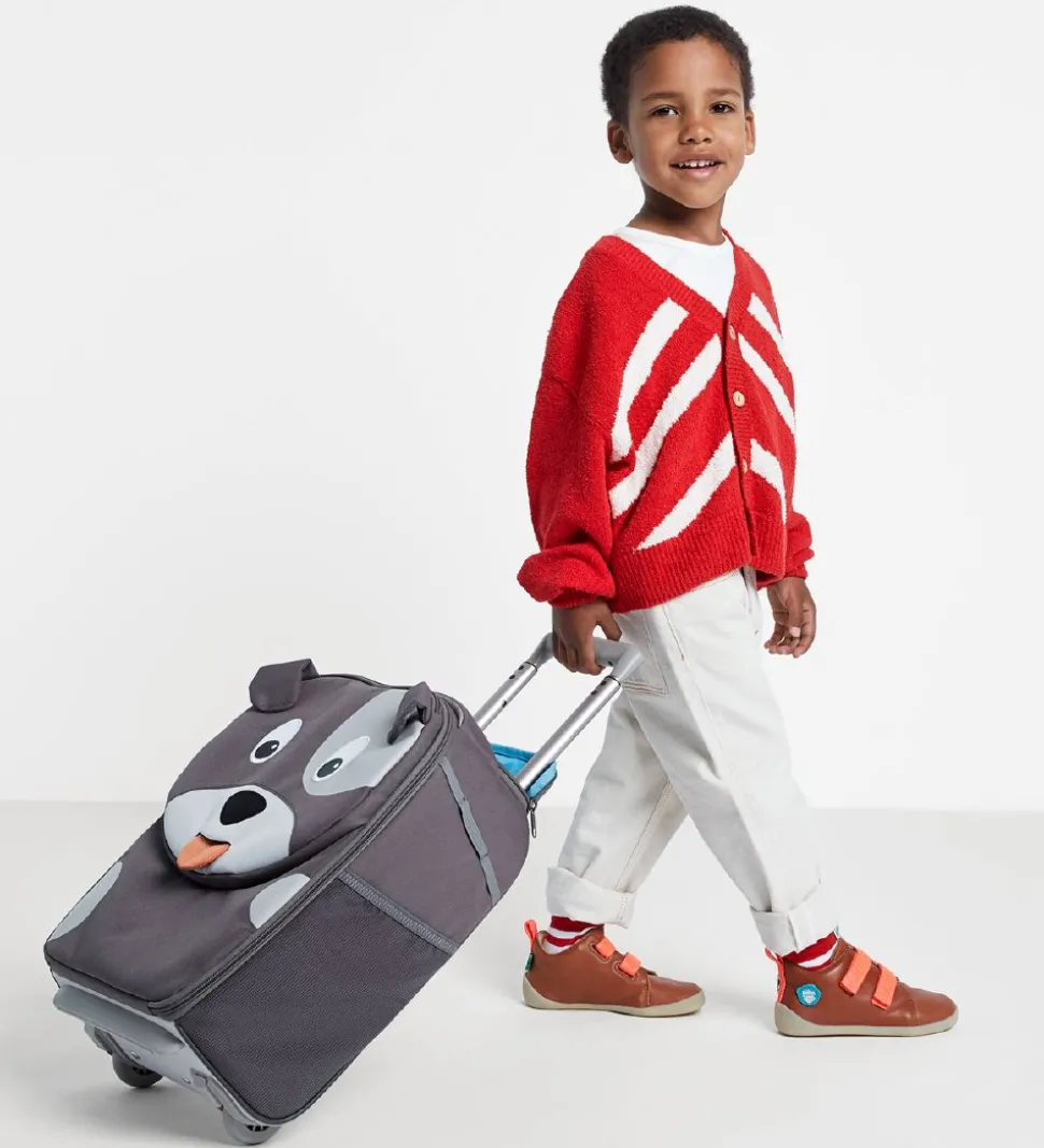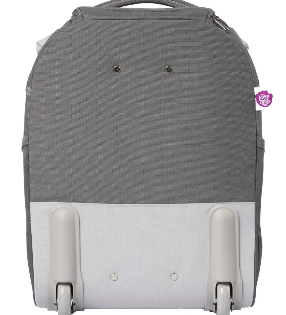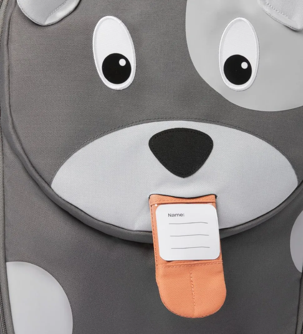 Sød Affenzahn trolley i grå nuancer med form som en hund. Fortil er der et par sorte og hvide øjne, en sort næse og en mund der rækker tunge. Tungen sidder fast med en elastik, og når man trækker i den, kommer der et navnemærke til syne.