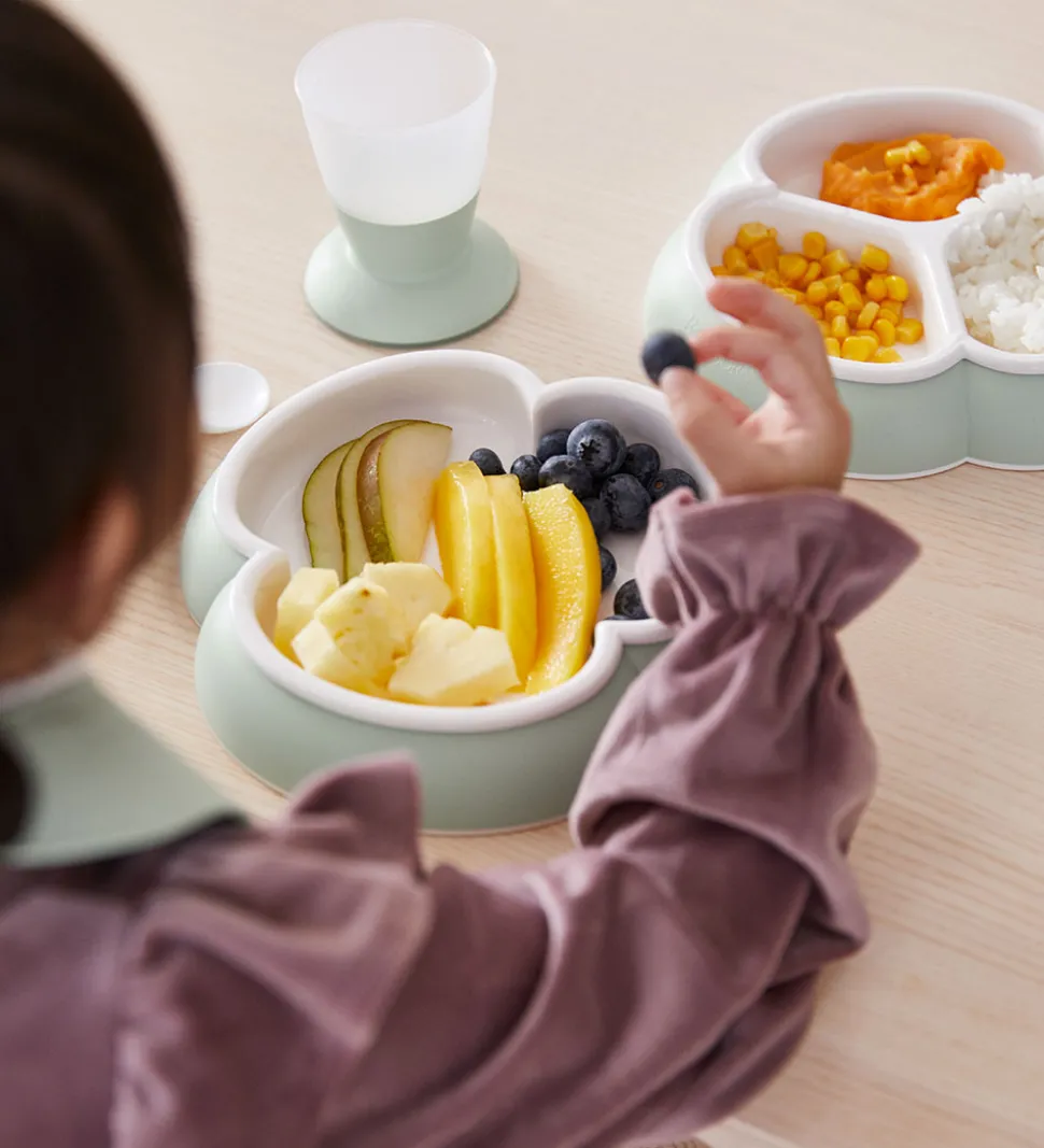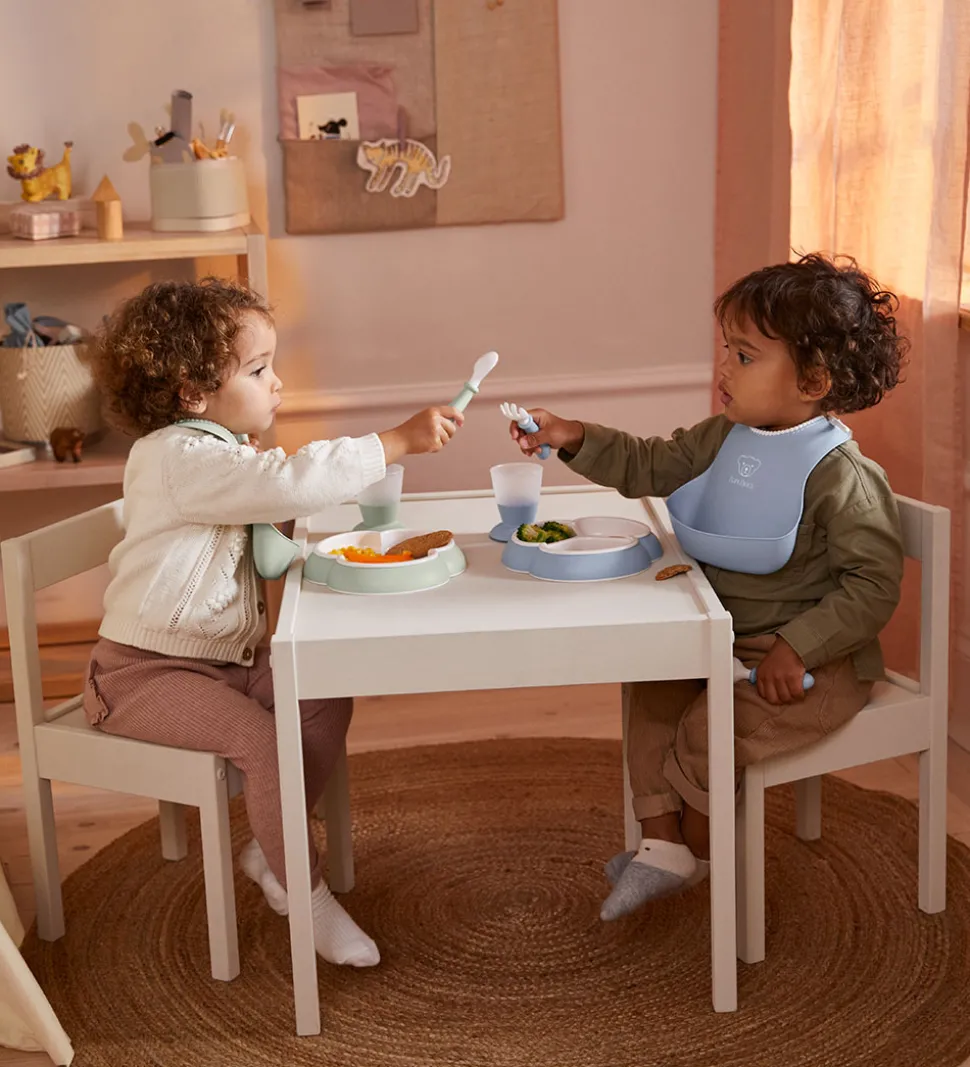 Skønt BabyBjörn spisesæt i pastelgrøn og hvid bestående af følgende otte dele:
