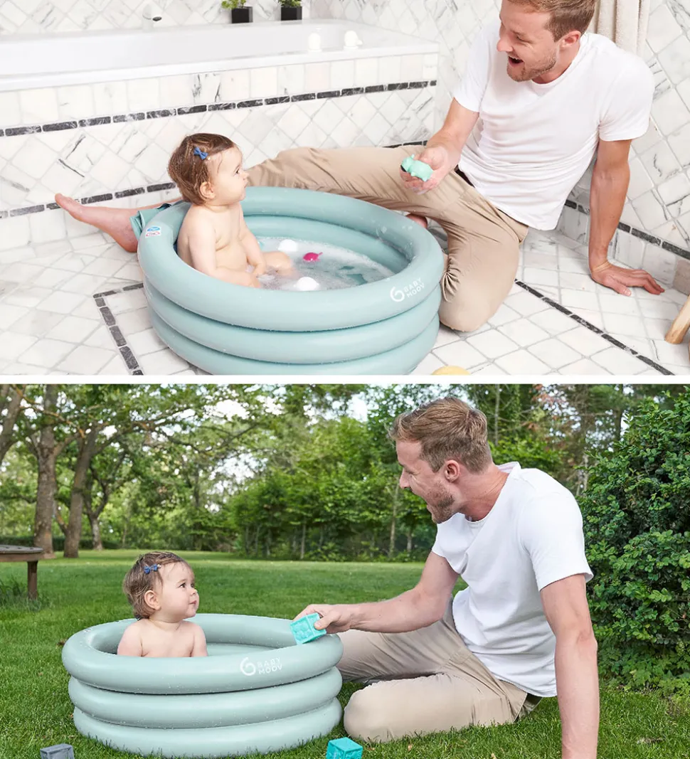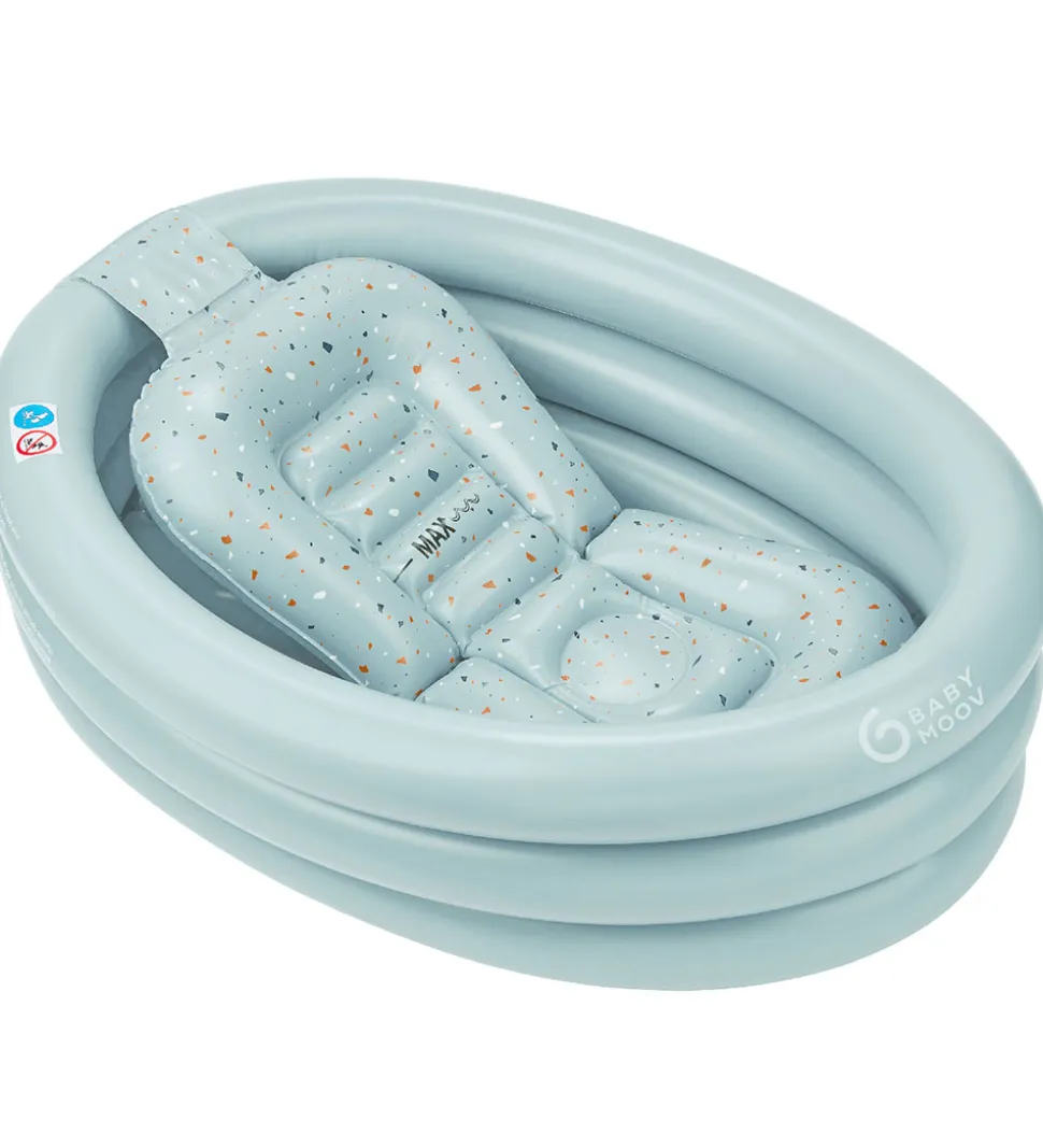 Babymoov badekarret er rundt og besår af 3 ringe, som pustes op hver for sig. Der medfølger et babysæde, så spædbørn kan sidde godt og sikkert i badekarret. babysædet kan tømmes for luft og placeres på ydersiden af badekarret med velcro. Herefter kan badekarret også benyttes, når barnet bliver større. I bunden er der en prop, så badekarret let tømmes for vand.