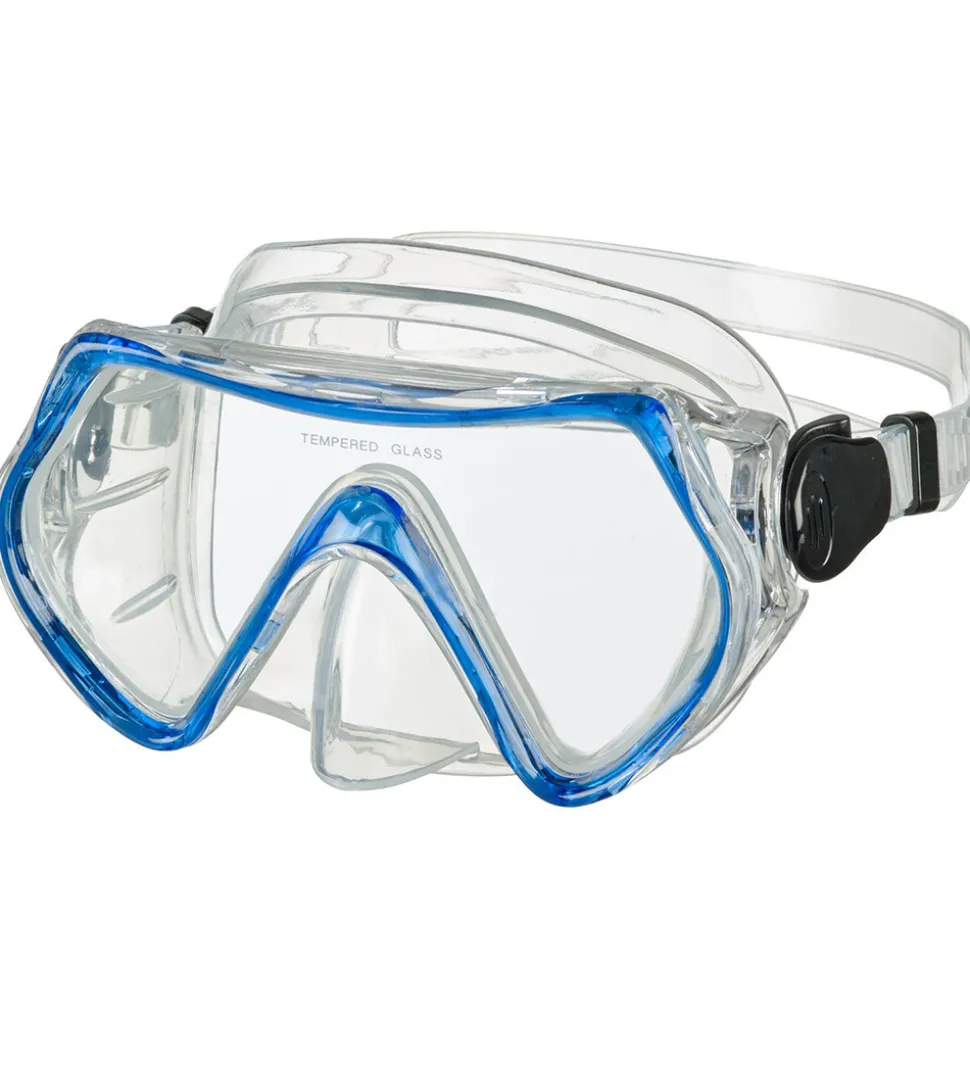 Fin BECO dykkermaske i transparent med en blå kant om glasset.