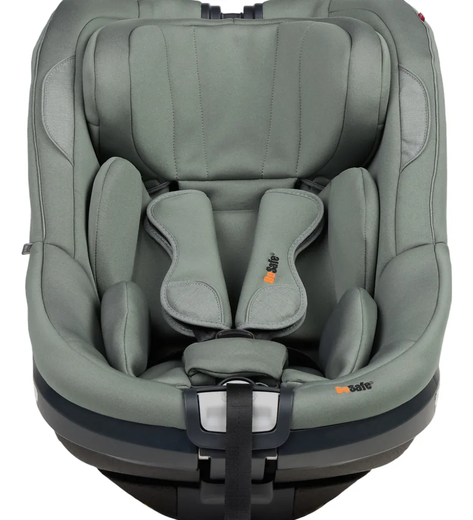 Fin BeSafe autostol i støvet grøn i modellen Beyond 360 2. Denne autostol er betrukket med et ekstra blødt og ånbart materiale og med ekstra polstring.