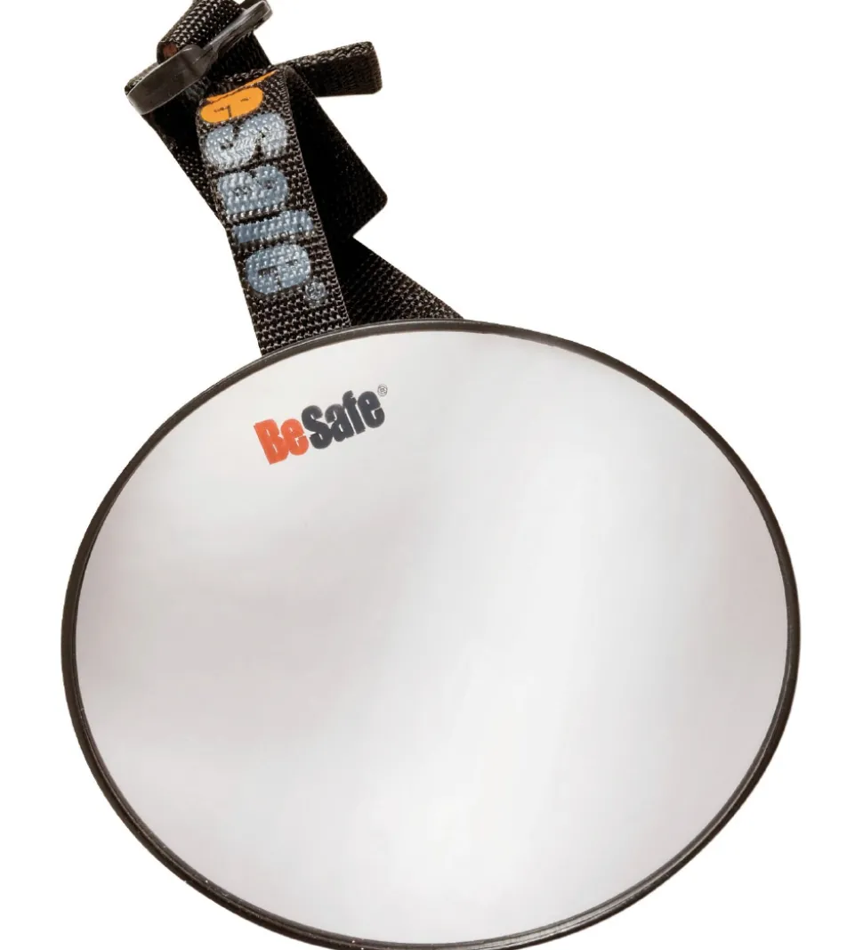 BeSafe babyspejlet er rundt, og det buer udad, så giver et godt udsyn. Spejlet monteres på en nakkestøtte med en rem med et klikspænde. Så kan du let holde øje med dit barn i en bagudvendt autostol på bagsædet.