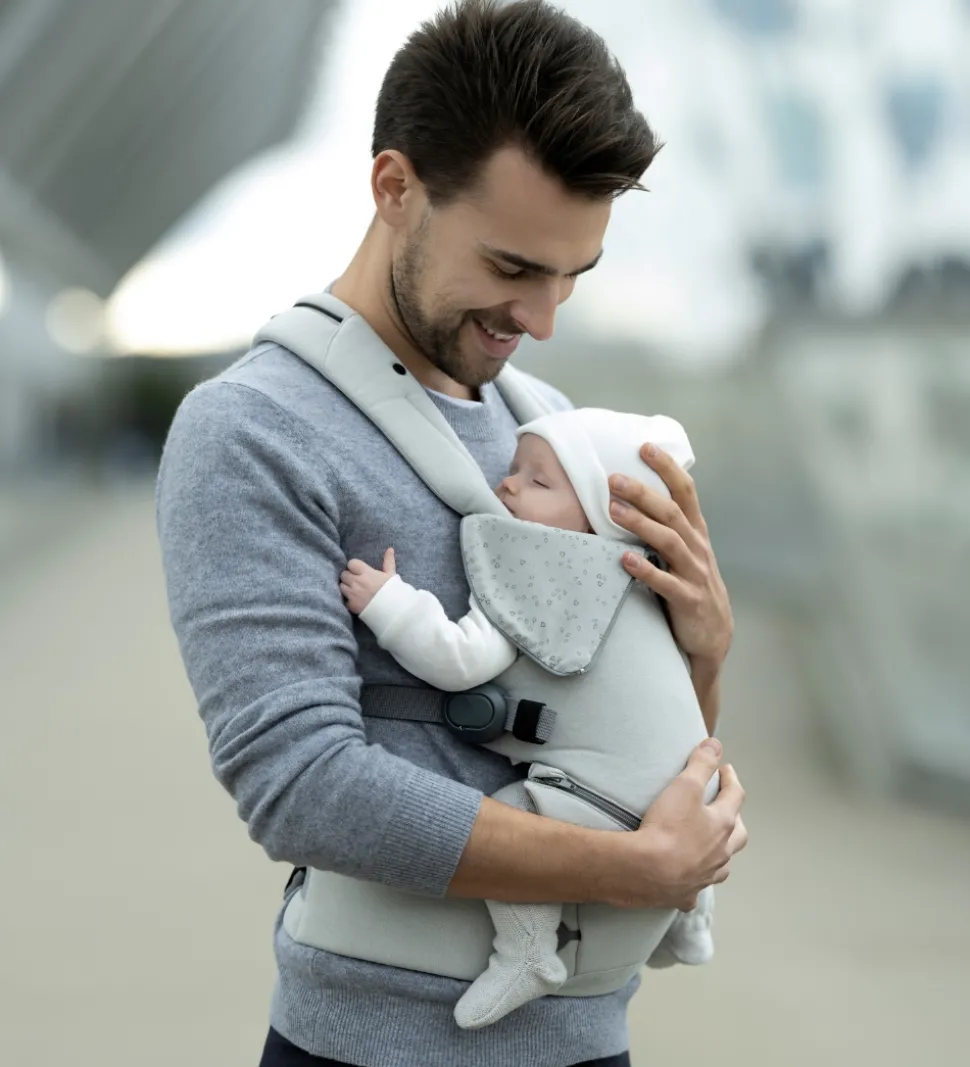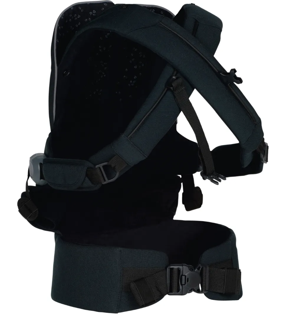 Selen spændes rundt om hofterne med et bredt mavebælte, som lukkes med et sikkert klikspænde med trepunktskontakt. Skulderstropperne kan justeres i længden, og som en smart detalje kan hver skulderstrop foldes sammen fortil, så de giver mest mulig plads til babyens hoved. Alle stropper kan let justeres i længden, så de kan tilpasses både barn og voksen.