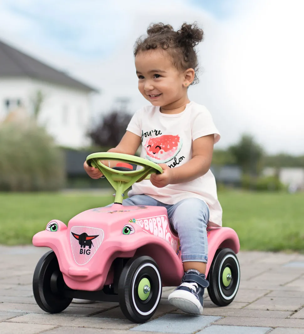 Smart BIG bil i rosa med grønne detaljer, blomsterprint og et stort logoprint på siderne. Bilen er af modellen Big Bobby Car Classic.