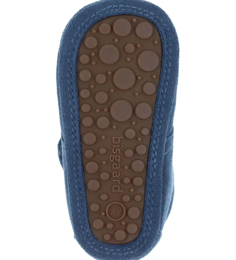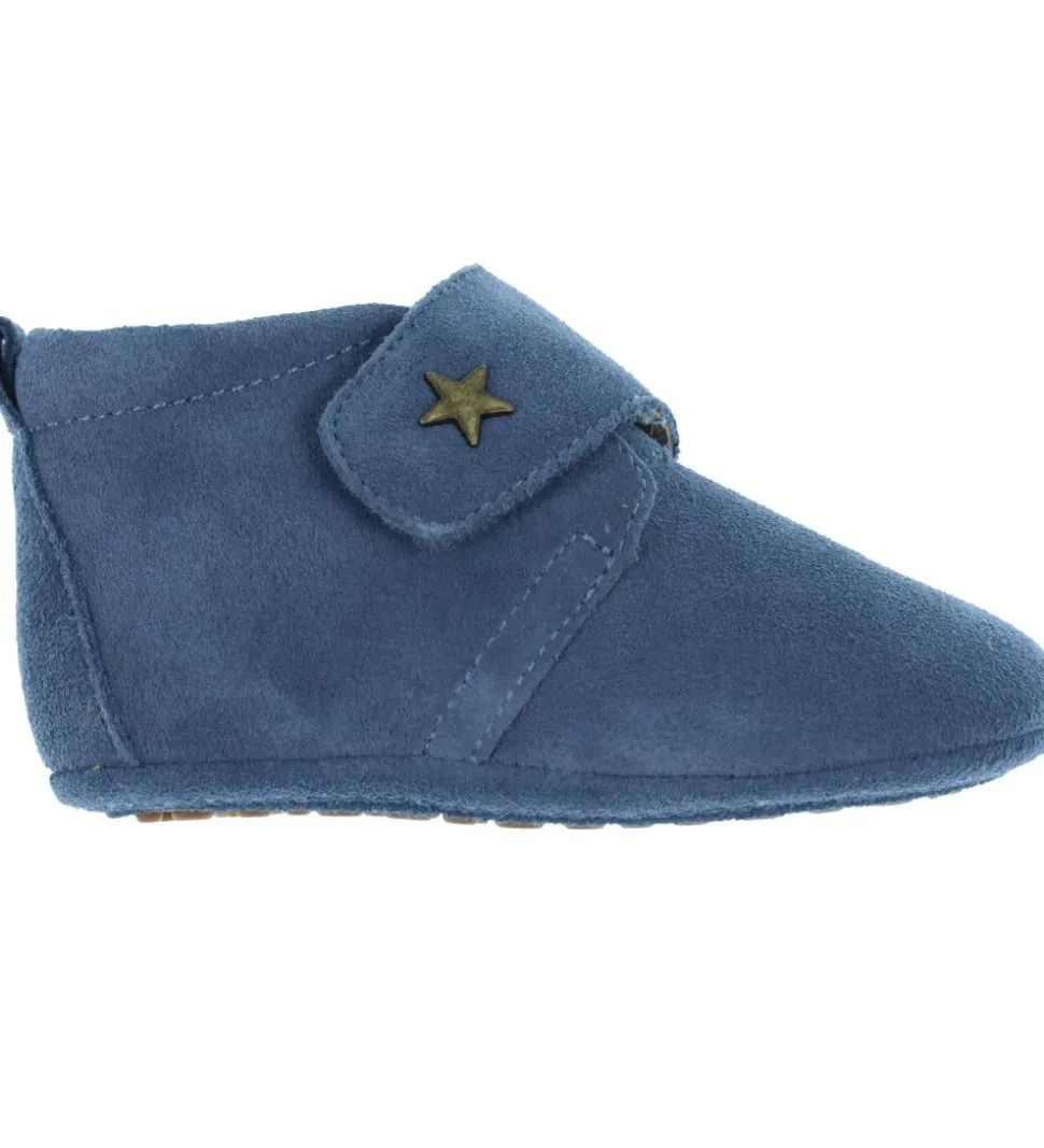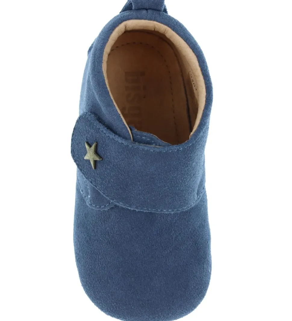 Smarte Bisgaard skindfutter i blåt ruskind, og yderst på velcroremmen sidder der en messingfarvet metalstjerne.