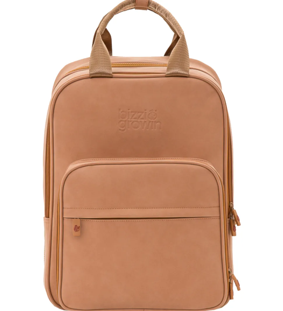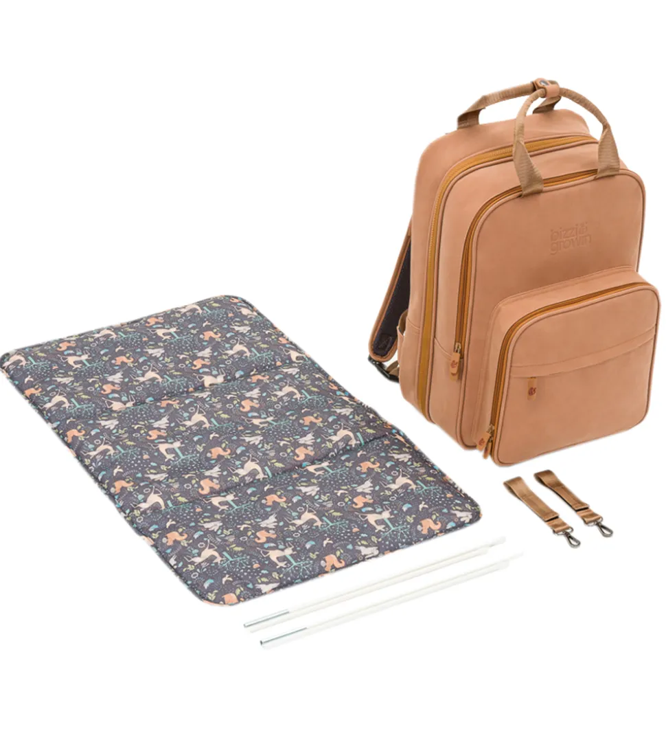 Smart Bizzi Growin kombineret pusletaske og rejseseng i lysebrunt, vegansk læder. Indvendigt har den et sort for med et farverigt dyreprint.