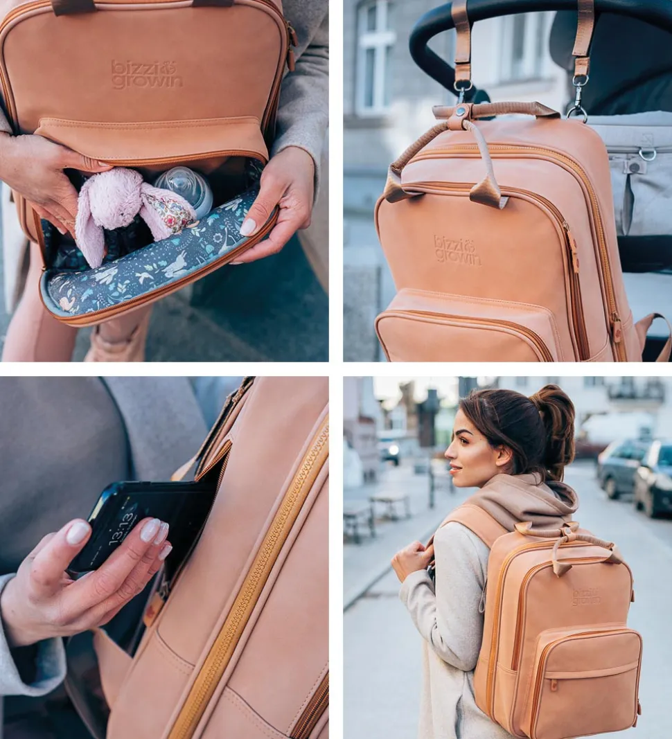 Den kombinerede pusletaske og rejseseng fra Bizzi Growin har justerbare, polstrede skulderstropper samt to bærehanke i toppen med trykknapssamling, og der medfølger også barnevognsstropper, så den kan fastgøres til barne- eller klapvognen.