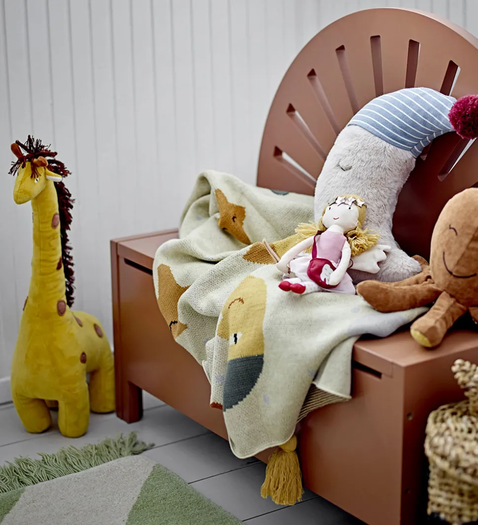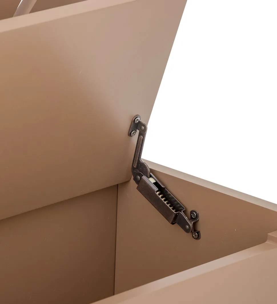 Bloomingville bænken har et flot ryglæn med udskæringer, så det ligner en sol. Sædet på bænken kan løftes, og nedenunder er der god opbevaringsplads til f.eks. legetøj. Låget har softclose og en praktisk udskæring, så små fingre ikke kommer i klemme.