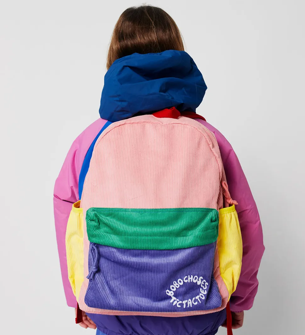 Farverig Bobo Choses skoletaske i en kombination af lyserød, grøn, blå og gul med fløjlstruktur.
