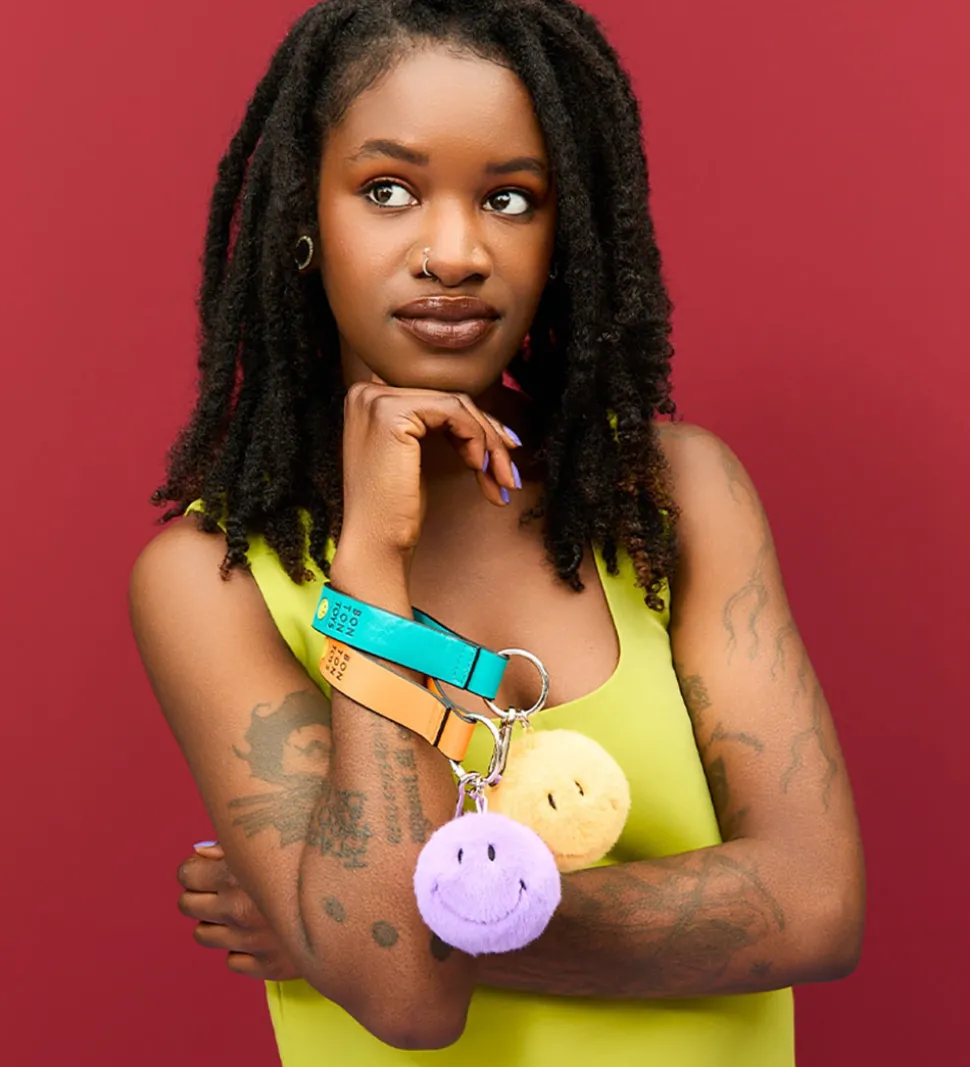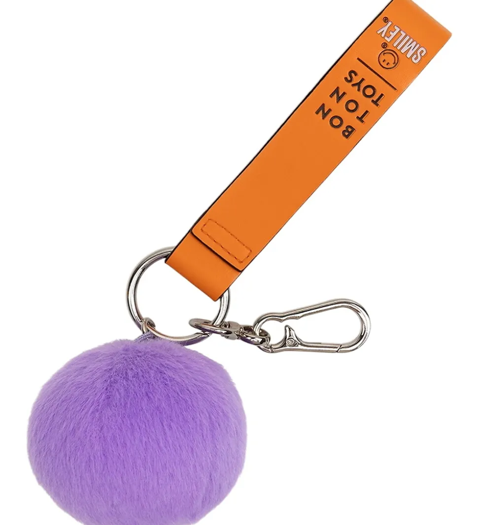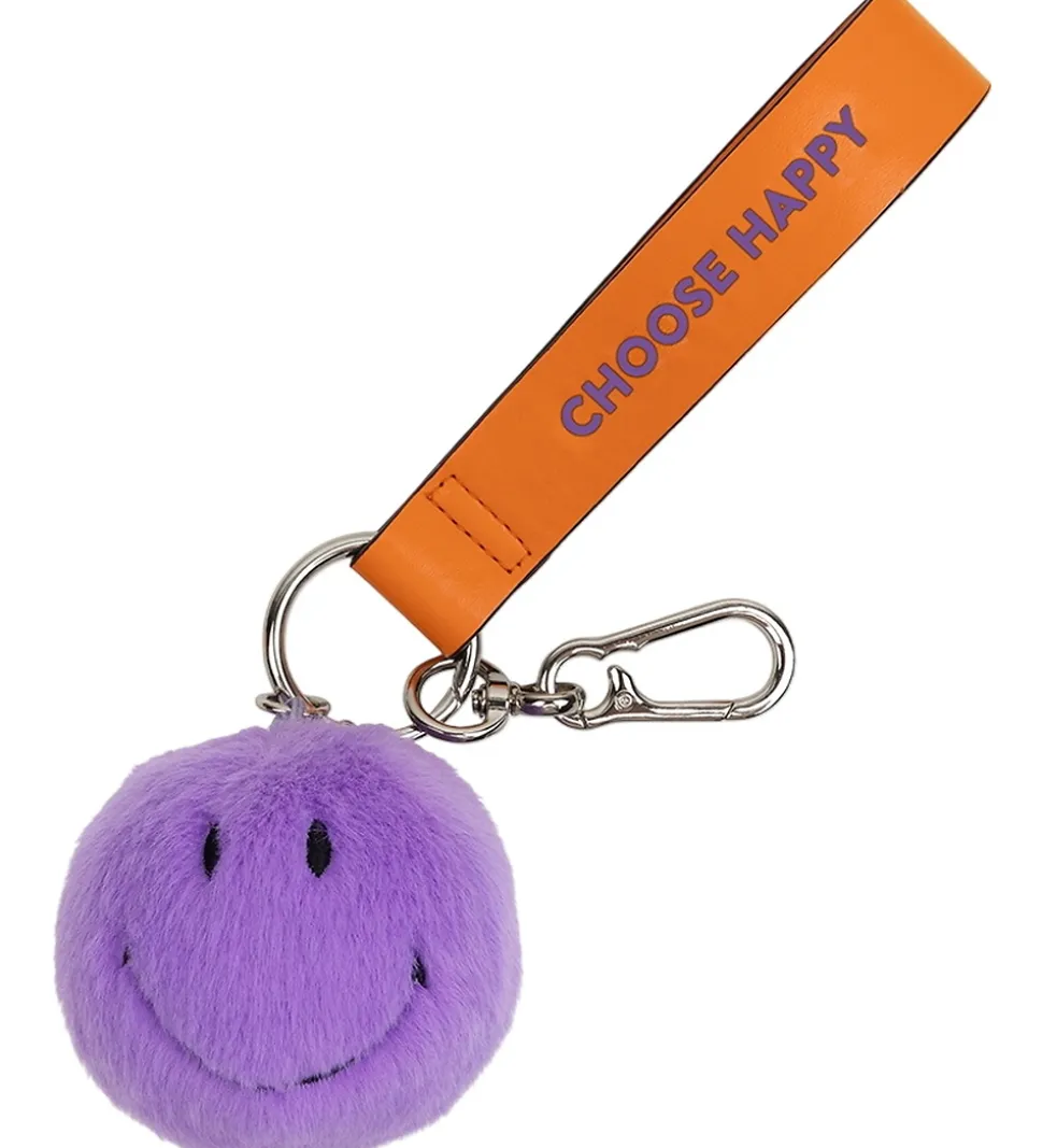Charmerende Bon Ton Toys nøglering i form af en rund smiley i lilla plys. Derudover er der en orange rem med teksten “Choose Happy” i lilla.