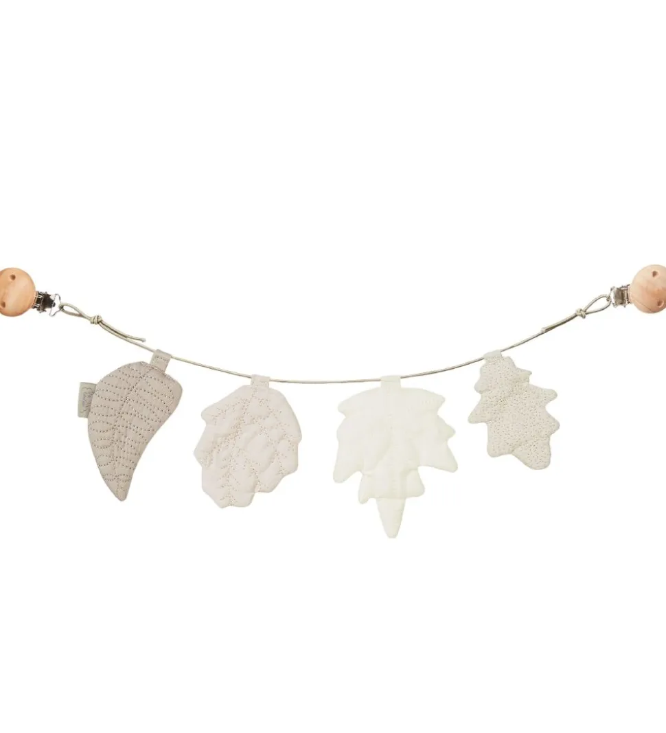 Sød Cam Cam Copenhagen barnevognskæde med fine blade i creme og sand nuancer.