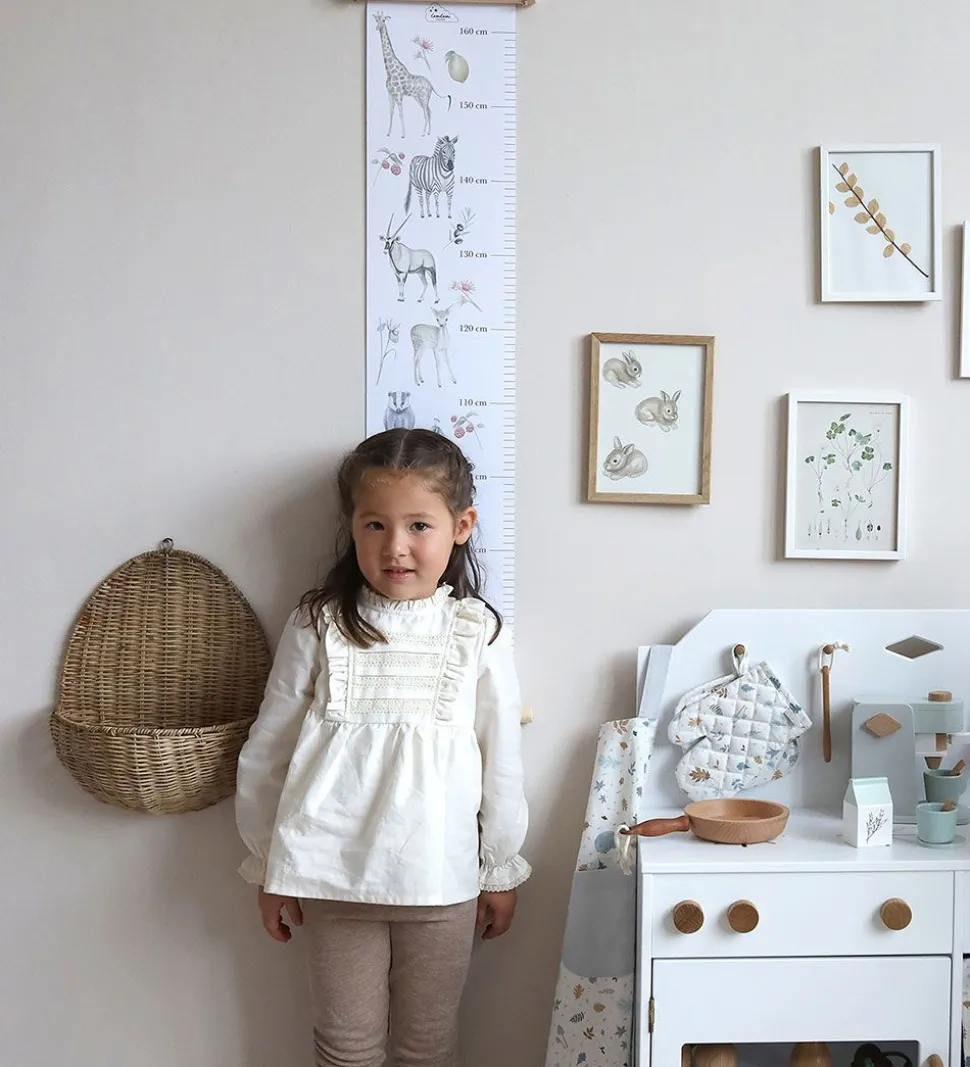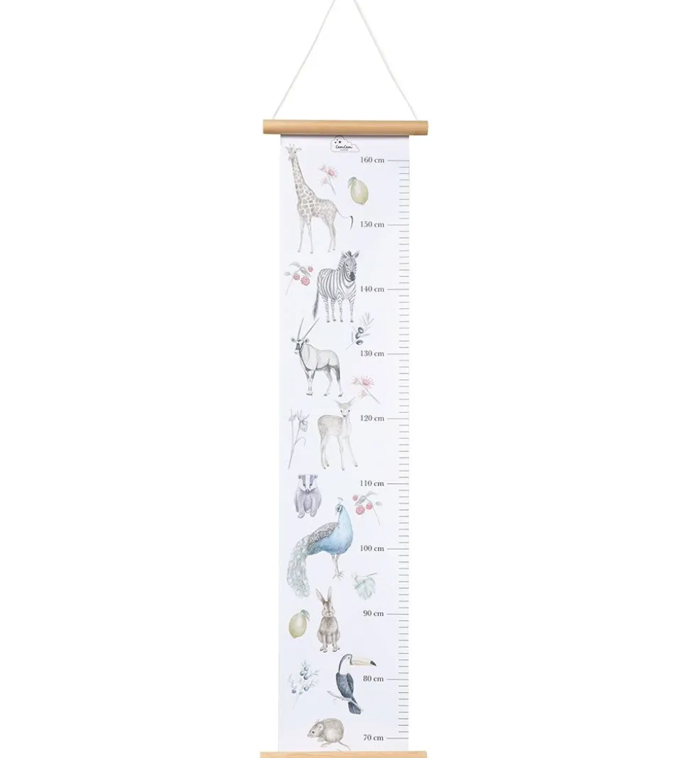 Smuk Cam Cam Copenhagen højdemåler med prints af vilde dyr, som bliver større og større samt frugter og blomster.