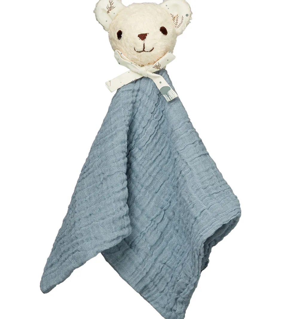 Sød Cam Cam Copenhagen nusseklud i støvet blå med et hvid bjørnehoved og med ører og en butterfly i et støvet blåt havdyr og -plantermønster.