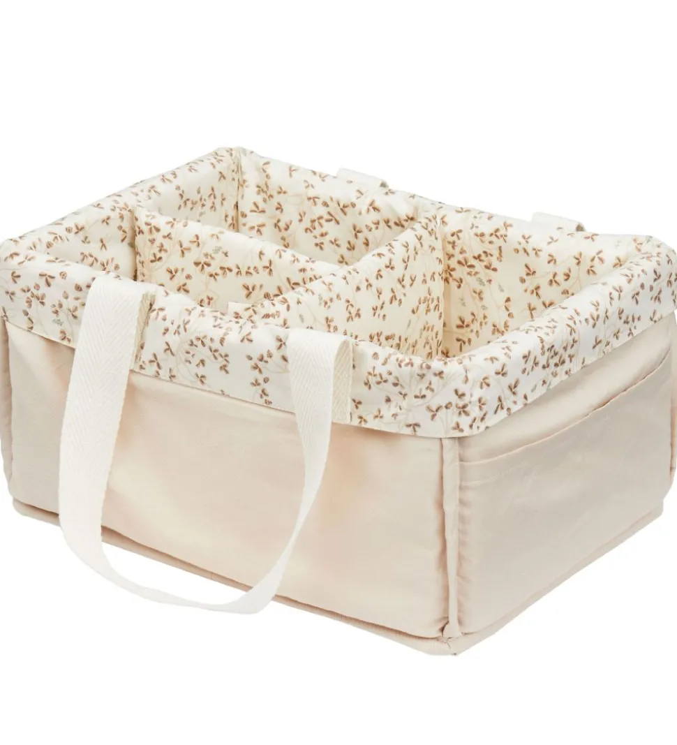 Fint Cam Cam Copenhagen pusleopbevaring i lysebrun på ydersiden og beige med et allover blomsterprint i brune nuancer på indersiden.