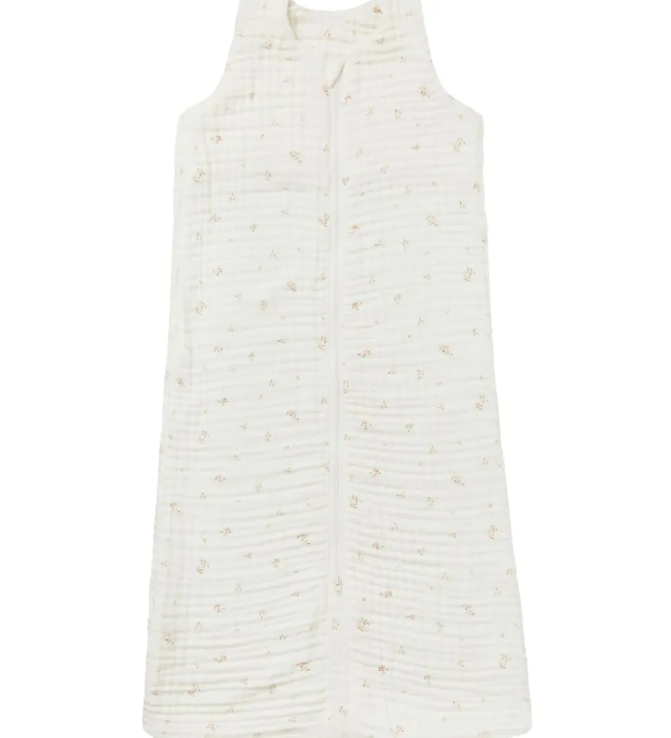 Lækker Cam Cam Copenhagen sovepose i hvid, med print af blomster i rosa og grå nuancer over det hele. Soveposen har en sød muslin struktur.