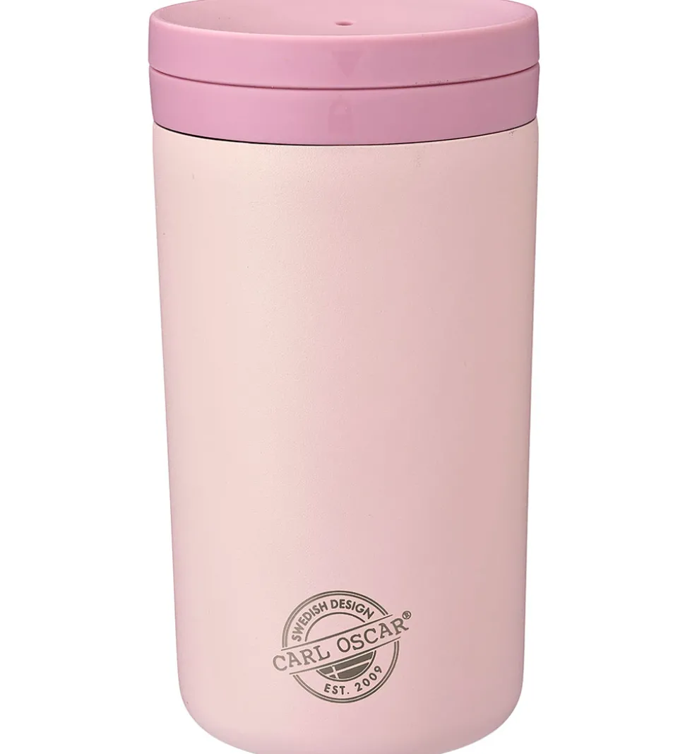 Fin Carl Oscar termokop i rosa med et logo fortil. Termokoppen har en kapacitet på 400 ml.