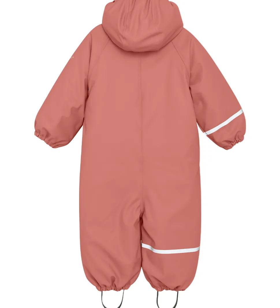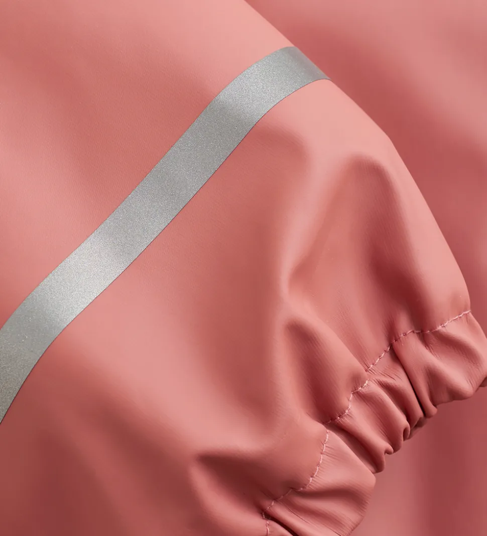 Dejlig CeLaVi regndragt i mørk, støvet rosa med en refleksstribe rundt om højre ærme og højre ben og et reflekslogo på venstre ærme og på hætten.