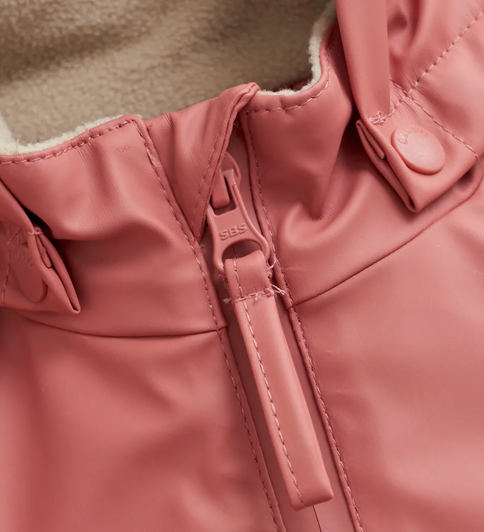 CeLaVi regndragten åbnes fortil med lynlås med hagebeskytter og indvendig vindstolpe. Regndragten er varmt vatteret og har et glatvævet for med lodrette syninger.