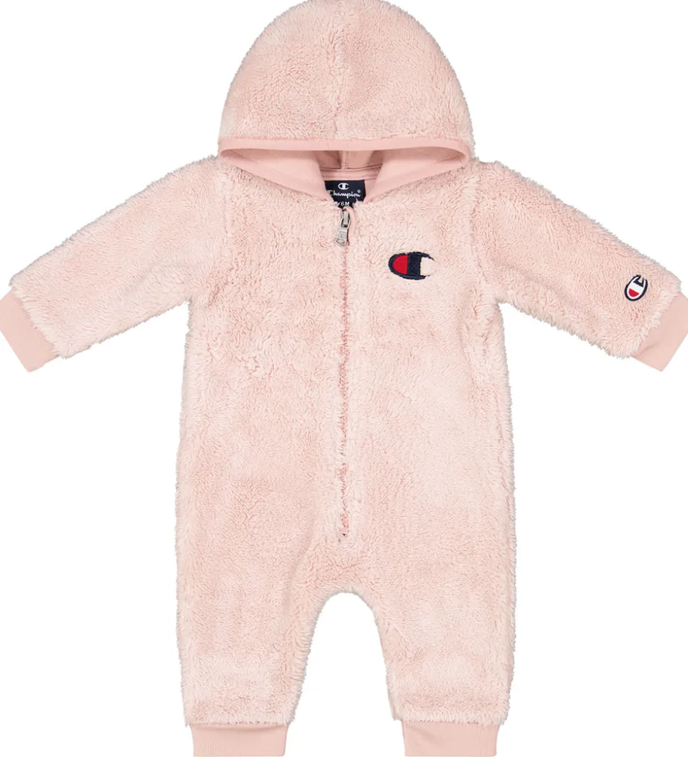 Sød Champion fleecedragt i rosa med et fint Champion-logo broderet på venstre bryst i navy, sort og rød.