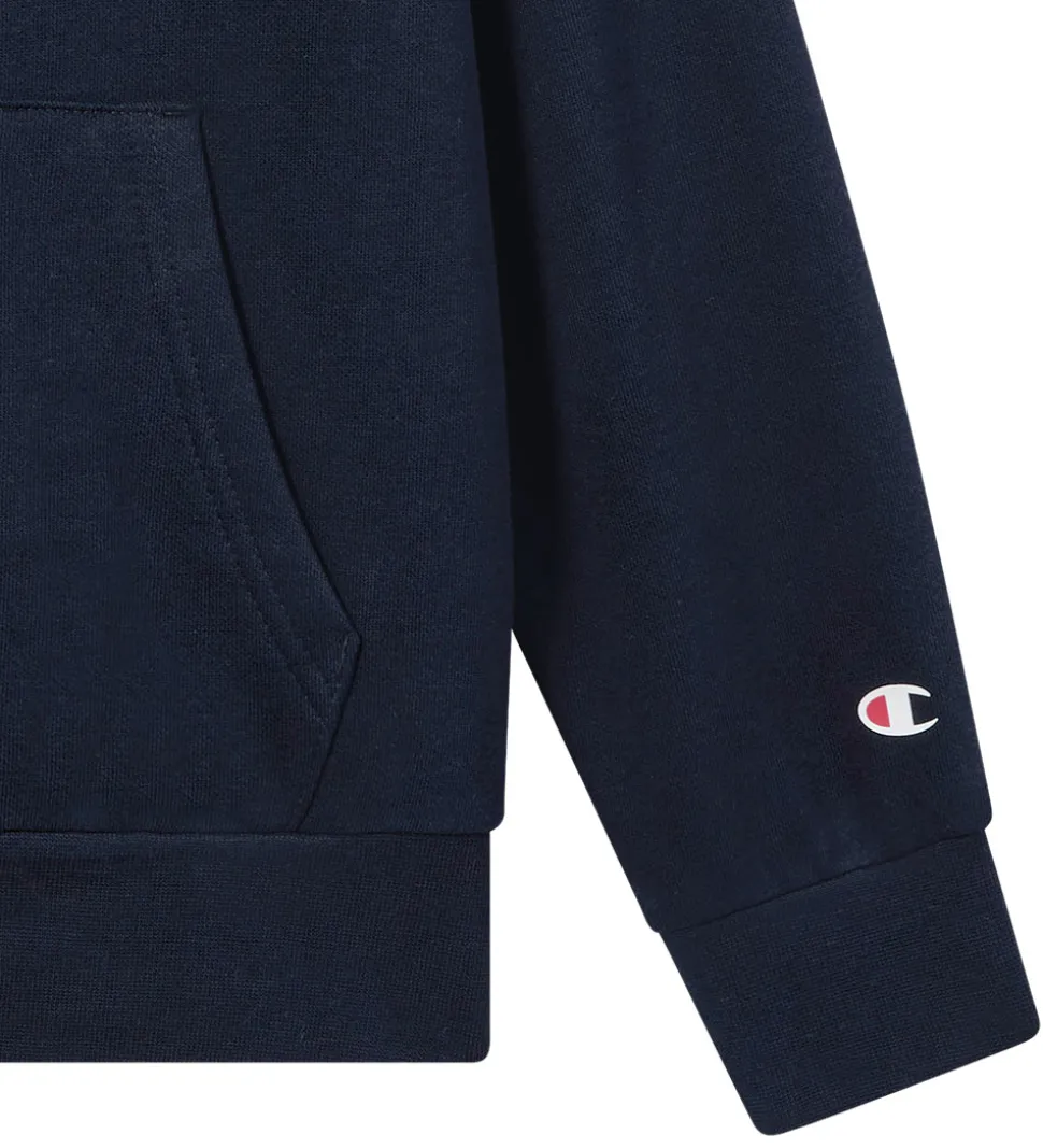 Flot Champion hættetrøje i en dyb marineblå farve. Hættetrøjen har et lille, hvidt Champion logo på brystet samt et logo på det ene ærme. Champion hættetrøjen er designet med en praktisk kængurulomme foran. Ribkanter ved ærmerne og forneden giver hættetrøjen en klassisk pasform. På inersiden er der blødt, børstet bomuld.