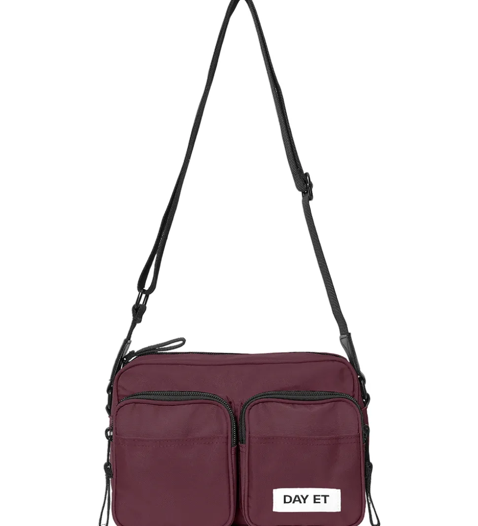 Smart DAY ET skuldertaske i bordeaux med kanter i imiteret læder, og et hvidt stofmærke fortil med teksten “DAY ET”.