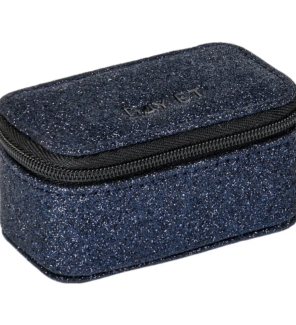 Lille DAY ET smykkeskrin i ensfarvet, navyblå glimmer.