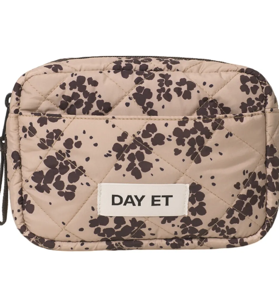 Lækker DAY ET toilettaske i rosabeige med et brunt mønster, en quiltet struktur og et logomærke i sort og hvid på fronten.