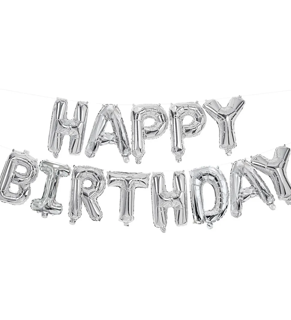 Flotte Decorata Party foileballoner i sølv, der tilsammen danner ordene “Happy birthday”.