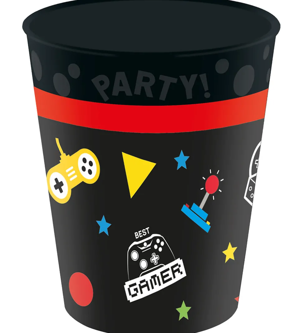Fine Decorata Party plastikkopper i sort med print i et gaming party-tema med flotte farver. Plastikkopperne er solgt som en 4-pak og har hver en kapacitet på 250 ml.