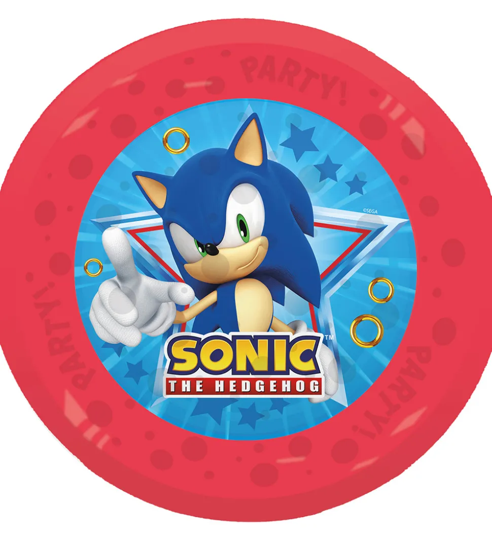 Fine Decorata Party plastiktallerkner i rød med print i et Sonic-tema med flotte farver. Plastiktallerknerne er solgt som en 4-pak.