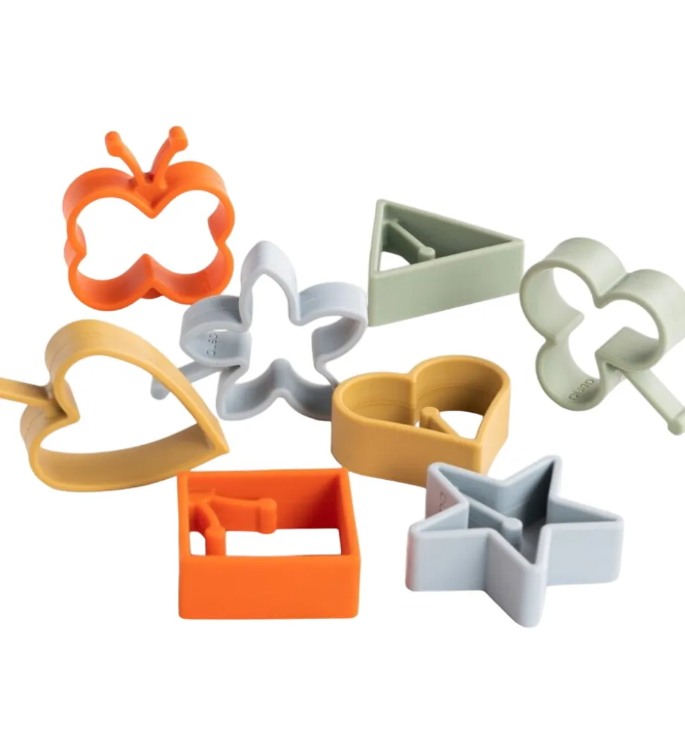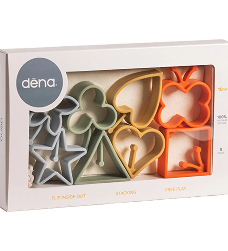 Dëna aktivitetslegetøjet har forskellige former og er i blødt silikone, så de forskellige former kan “flippes” og tage en ny form. De kan også stables og leges med efter fri fantasi. Aktivitetslegetøj er fri for BPA, PVC, latex og ftalater.