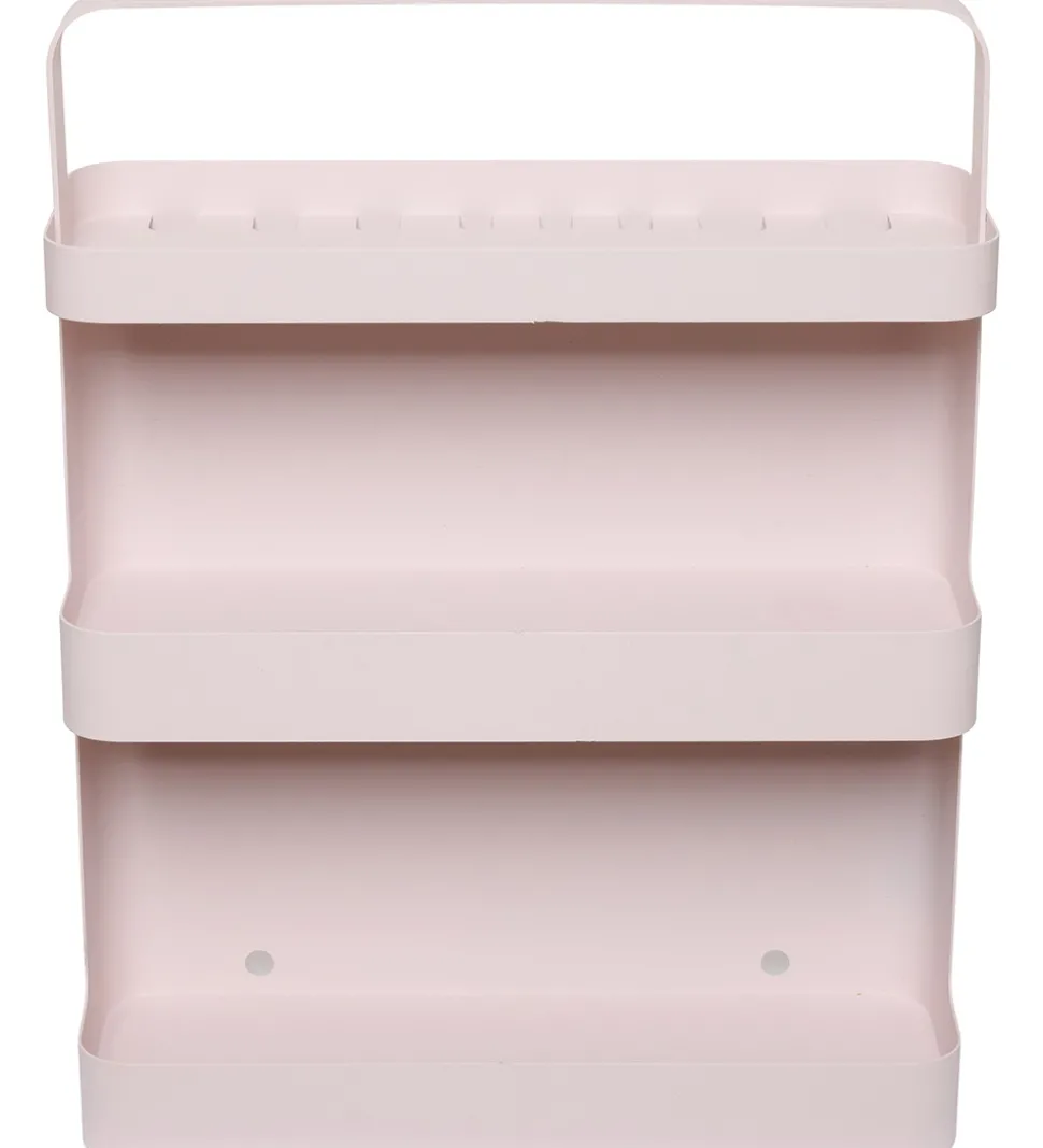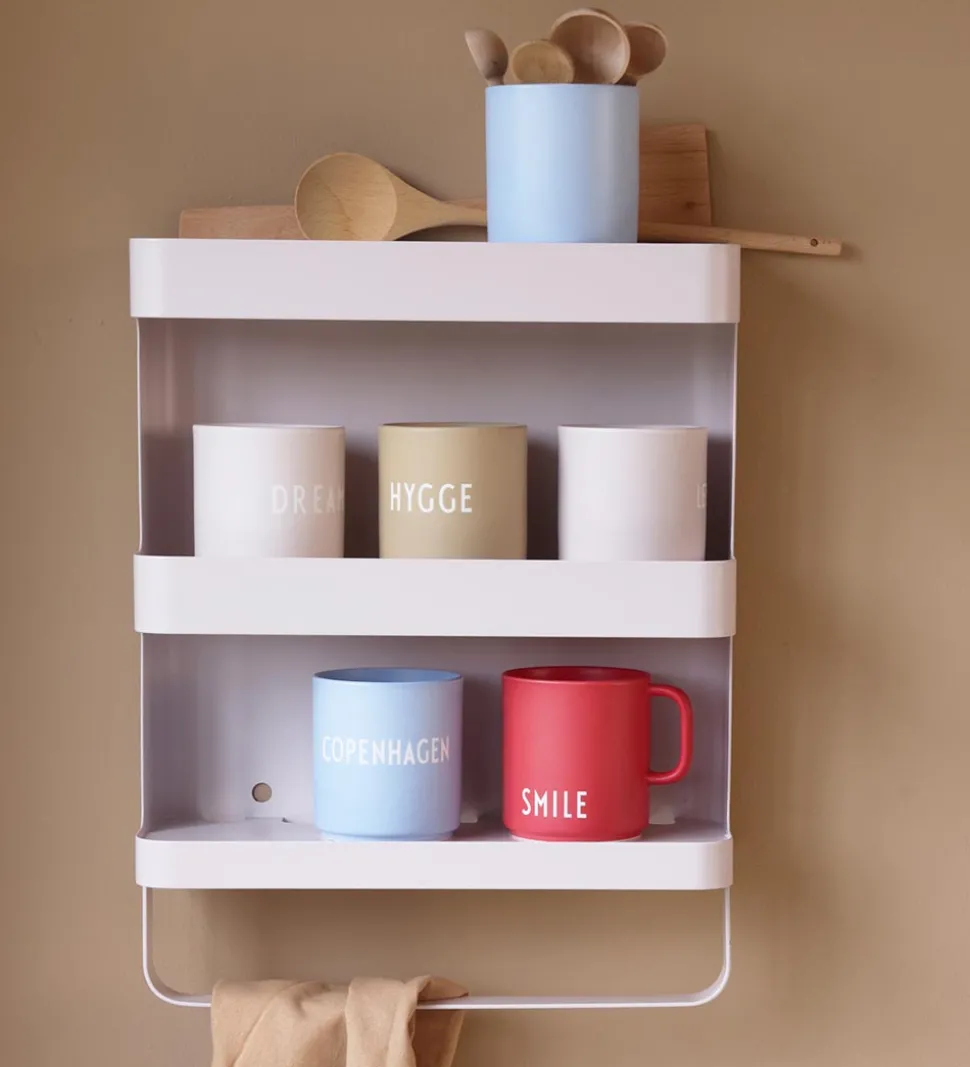 Design Letters hylden består af tre hylder, og toppen har den en praktisk hank, så man kan flytte rundt på hylden. Og hvis hylden vender den ene vej, kan hanken bruges som støtte til lange ting, og hvis den vender den anden vej, kan den f.eks. bruges til håndklæder eller viskestykker. Der er desuden en magnet, som holder din telefon atsbil, hvis du gerne vil bruge mobilens kamera som spejl.
