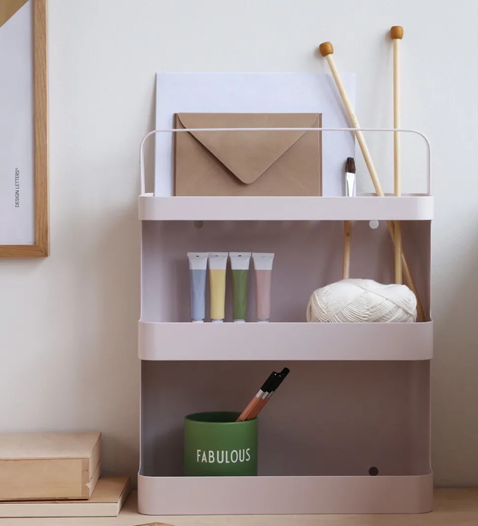 Design Letters hylden er multifunktionel, og den kan bruges til alverdens opbevaringsløsninger på badeværelset, på kontoret eller i køkkenet. Den kan enten stå på et bord, eller den akn hænges op på væggen.