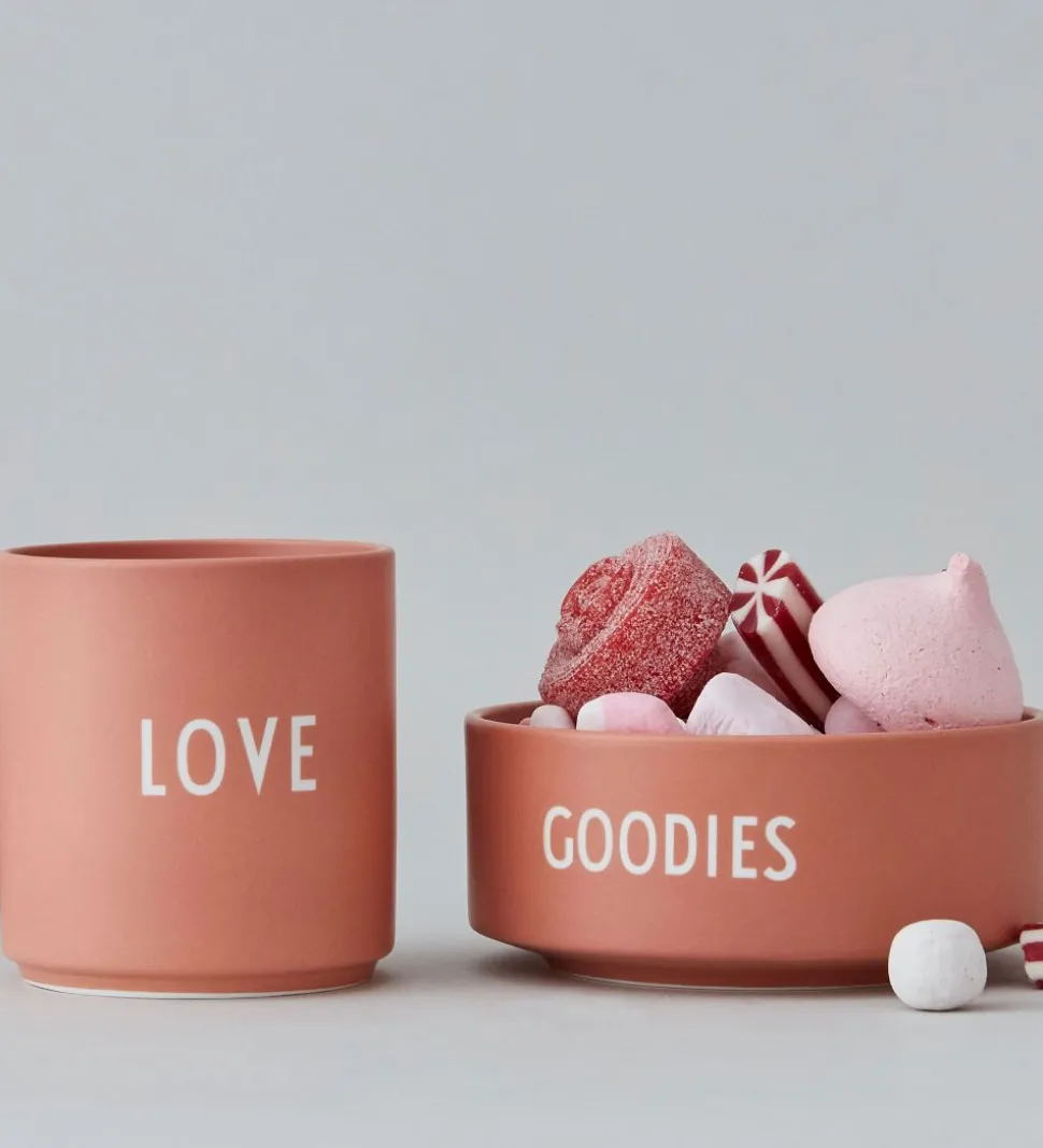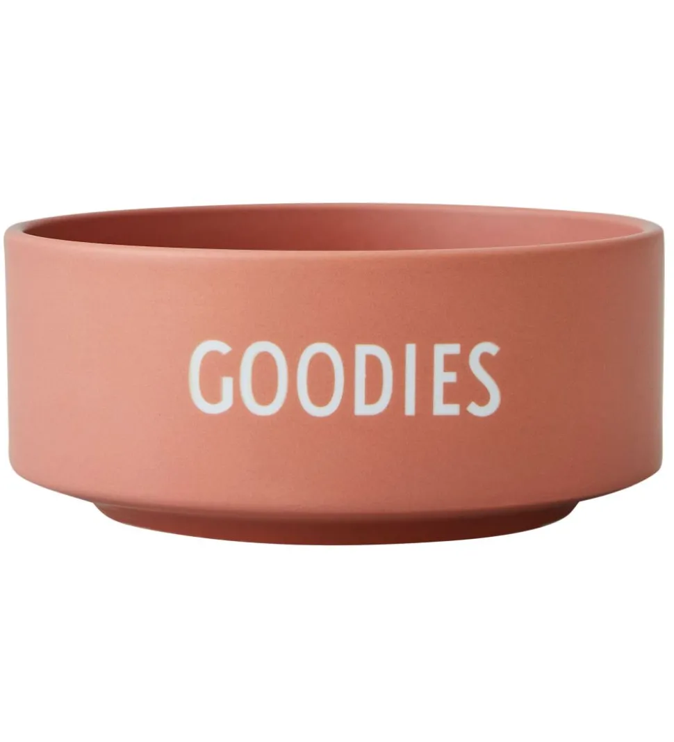 Praktisk Design Letters skål i orange, med “GOODIES” i hvid fortil.