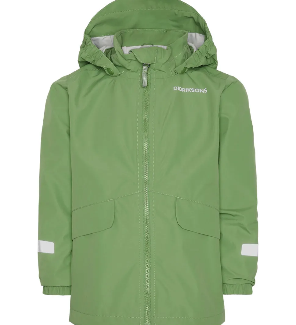 Didriksons sommerjakken har en aftagelig hætte, der er fæstnet med trykknapper langs den høje halskrave. Hættens ansigtsåbning har elastikkanter i siderne og en skygge i toppen. Ærmerne har praktiske elastikkanter i åbningerne.