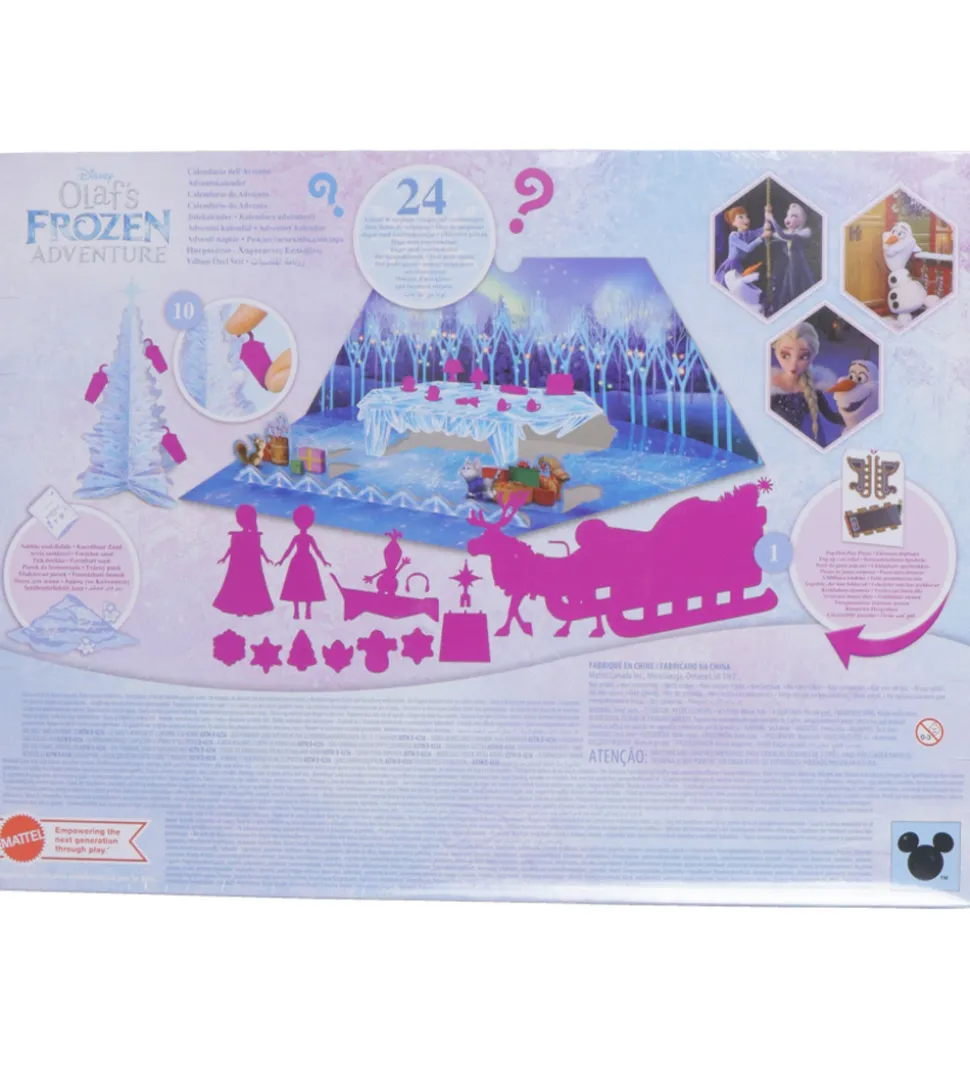 Julekalenderen indeholder 24 låger, hvoraf man kan lave et flot 3D landskab af de 24 overraskelser. Barnet begynder nedtællingen til jul sammen med de velkendte Disney Frozen karakterer.