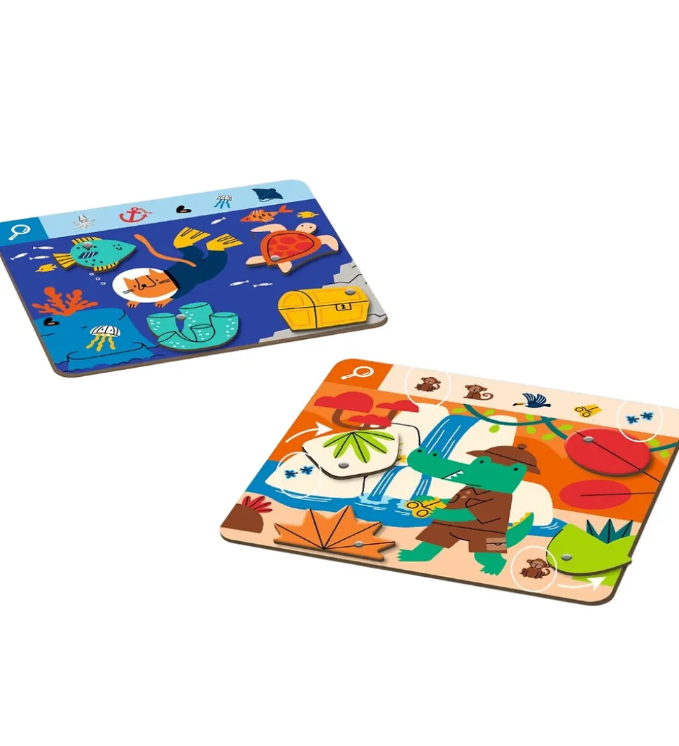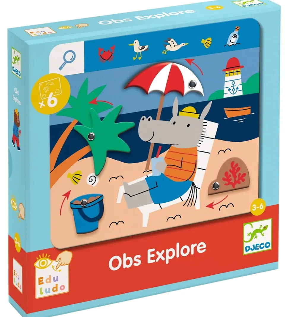Djeco spillet består af 6 kort med forskllige motiver i klare farver og med masser af detaljer. Her gælder det om at gøre sig umage med at finde de skjulte motiver bag brikkerne, som kan drejes til side.