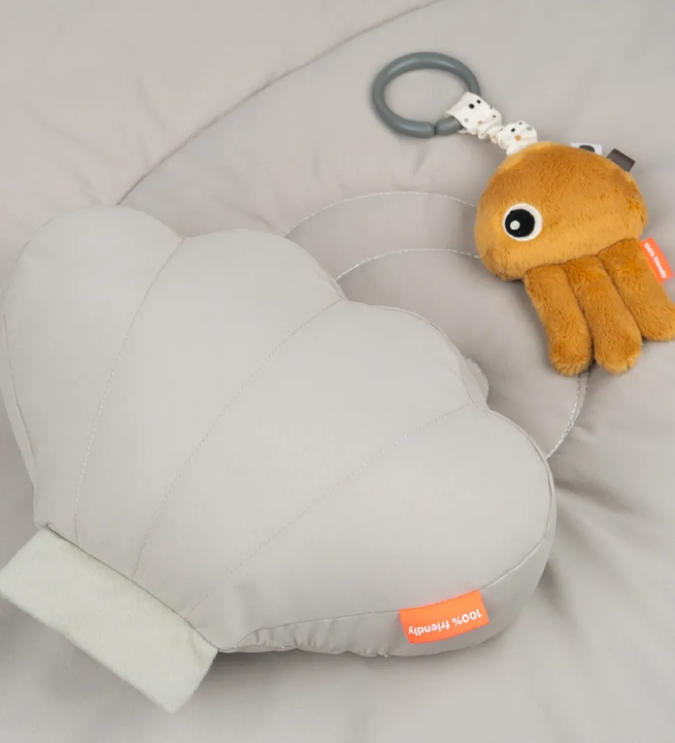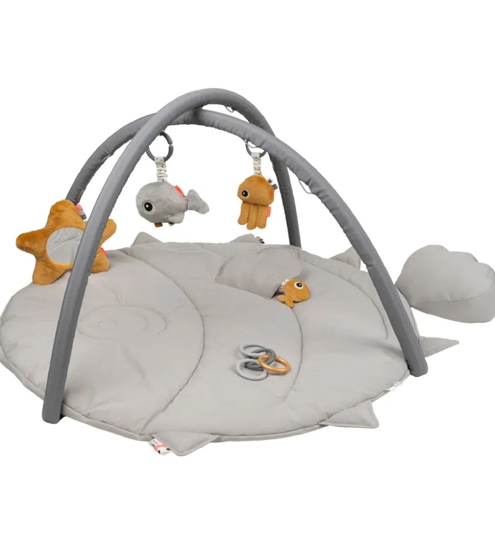 Tæppet er designet som en sød fisk med finner, der fungerer som nulreflapper og en enkelt som støttepude. Tæppet er utrolig blødt og tykt med et quiltet design, så barnet ligger behageligt. Til tæppet medfølger der 5 forskellige havdyr i form af aktivitetslegetøj, der stimulerer barnets sanser. Aktivitetslegetøjet hænges på stativet med de medfølgende C-ringe.