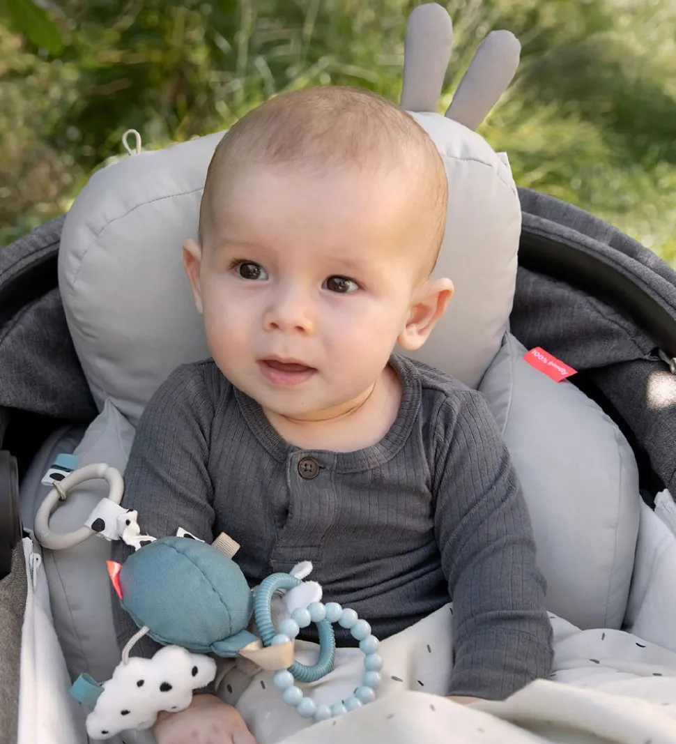 Done By Deer puden giver barnet stabilitet og støtte, når barnet sidder i barnevognen. På puderne i siden er der små flapper som barnet kan lege med, og de to sidepuder kan knappes sammen med trykknapper. Puden er vatteret og fremstillet i en blød kvalitet.