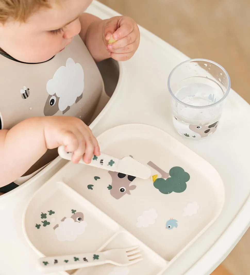 Praktisk Done by Deer tallerken i en lys sandfarve med et sødt print af koen Dotti og fåret Sheepy.