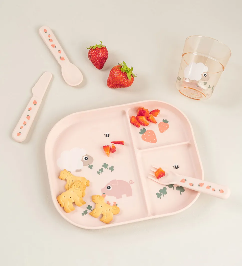 Sød Done by Deer tallerken i lyserød med et spændende print af grisen Pigee og fåret Sheepy.