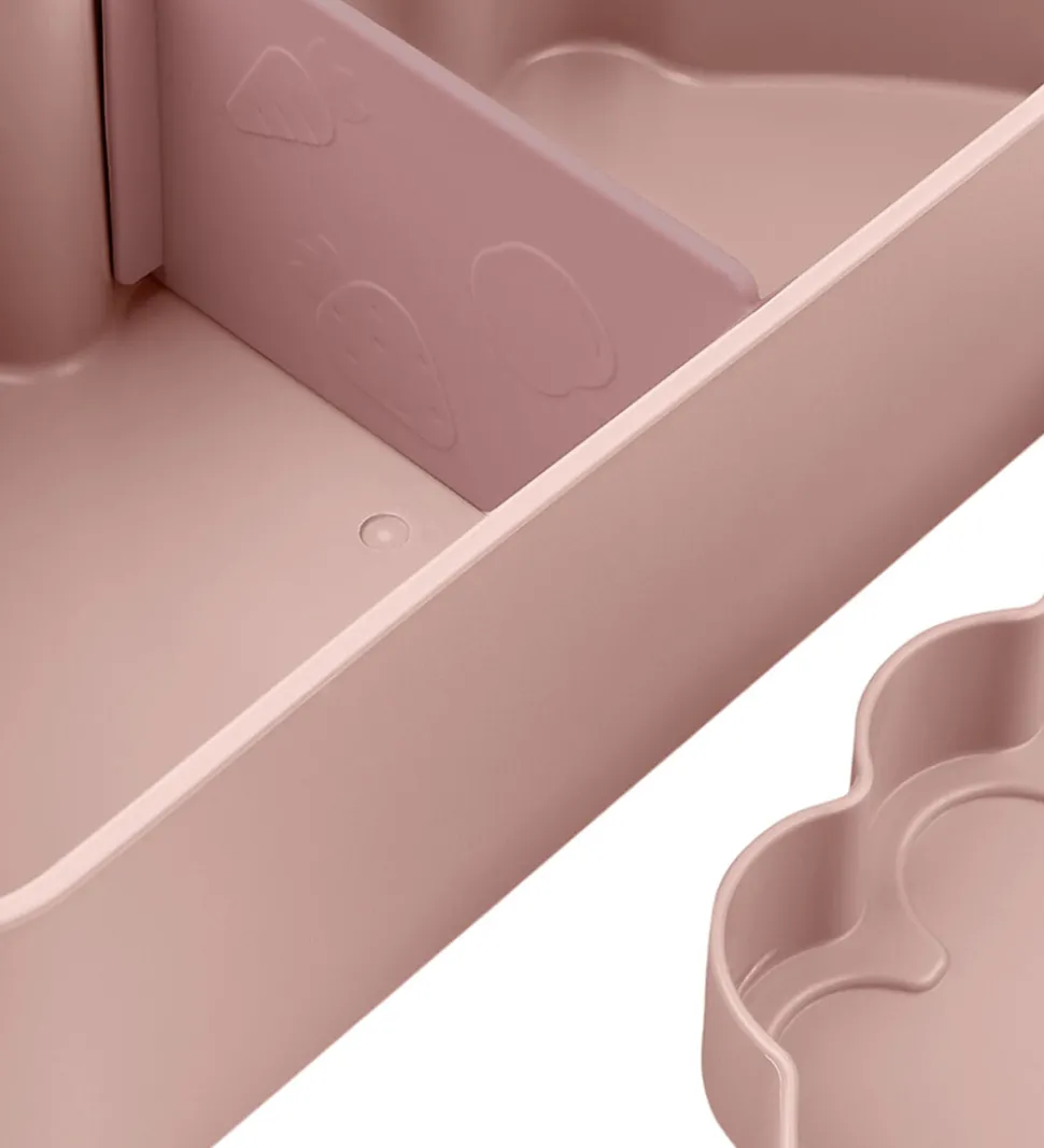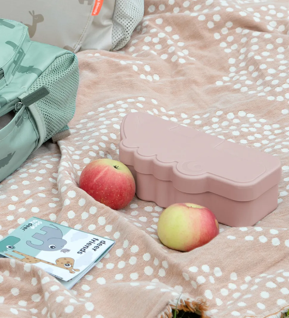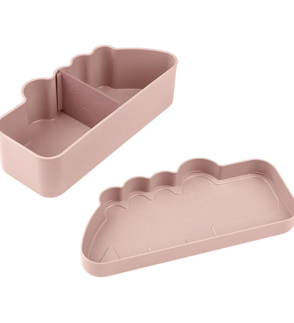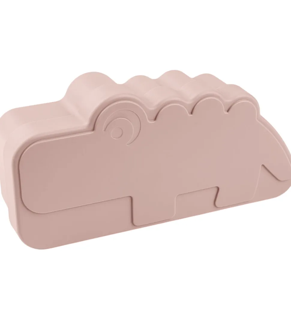 Sød Done by Deer madkasse i en støvet, rosa nuance, med form som krokodillen Croco. Done by Deer madkassen åbnes ved at løfte låget af og låget klikkes let på igen. Madkassen har en flytbar rumdeler og god plads til både snacks og mad.