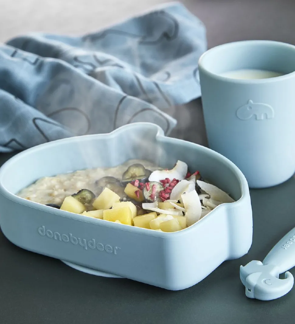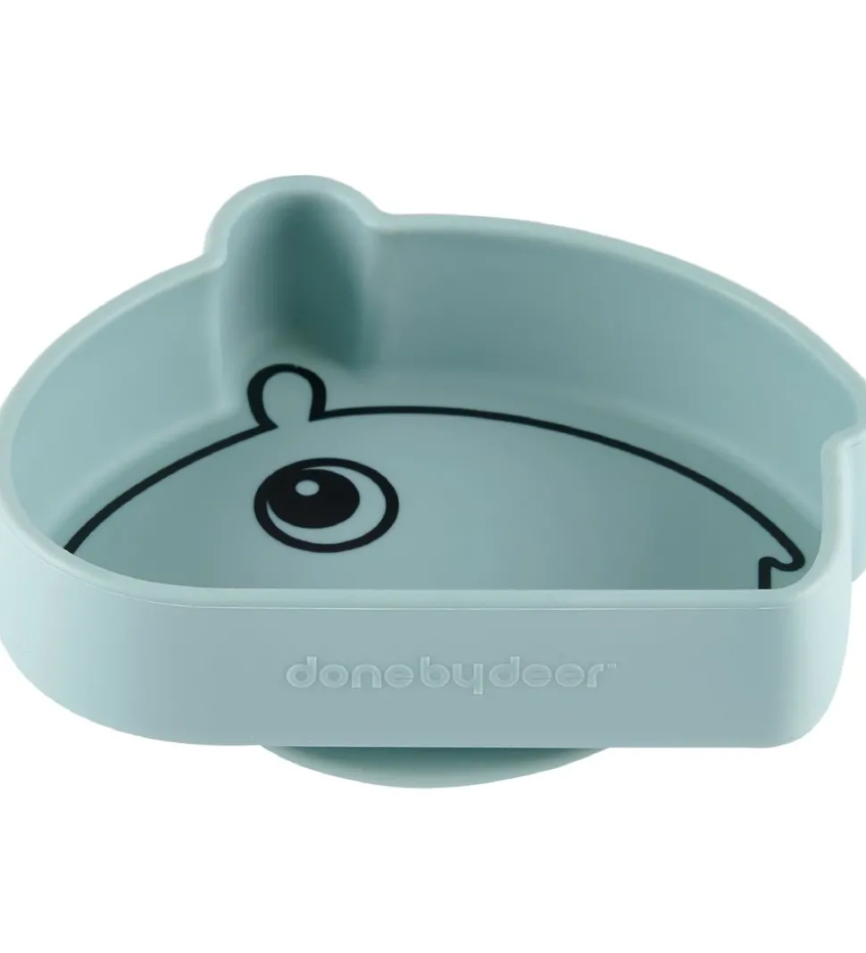 Done By Deer skålen er lavet af silikone, og på undersiden har den en rund flade, som gør, at den sidder godt fast på bordpladen. På denne måde er det sværere for barnet at vælte den. Skålen har også høje kanter, så den er lettere for barnet at bruge.